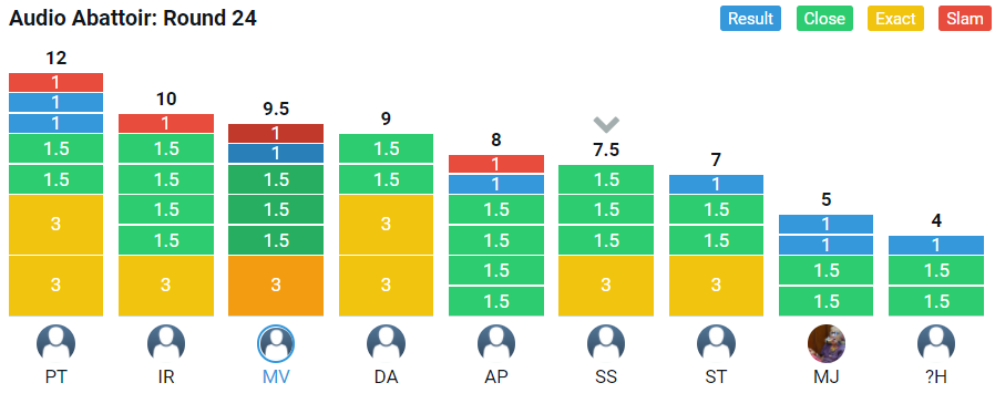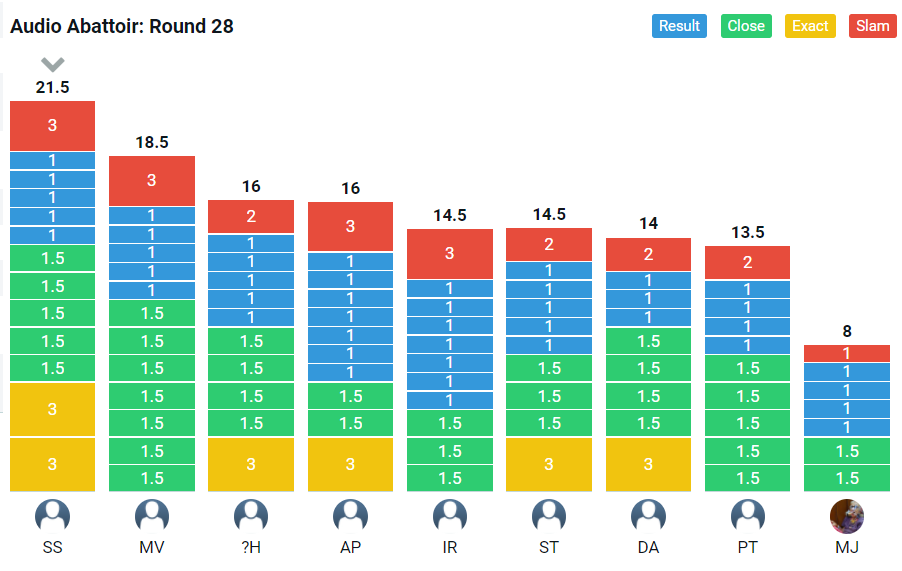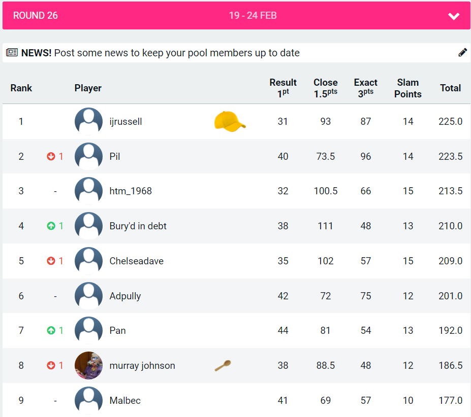 Round 26 results are all in and @Ijrussell takes the prize with 18 points, ahead of @sjs and @malbec on 14.