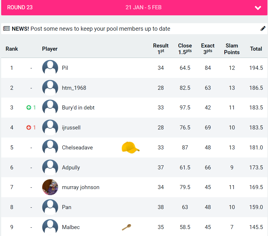 Round 23 is finally concluded, and as previewed last week, @chelseadave takes the crown this week from @stu, with @malbec receiving the wooden spoon