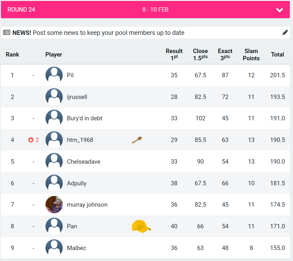 Round 24 results are in and @Pan takes the win with 12 points, whilst @htm_1968 picks up the wooden spoon with 4 points, which drops Olan down to 4th overall.