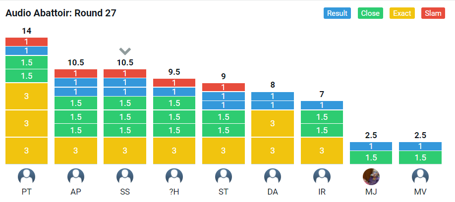 Round 27 results are in and @Pan takes the win with 14 points, whilst @murrayjohnson and @malbec share the wooden spoon with 2.5 points
