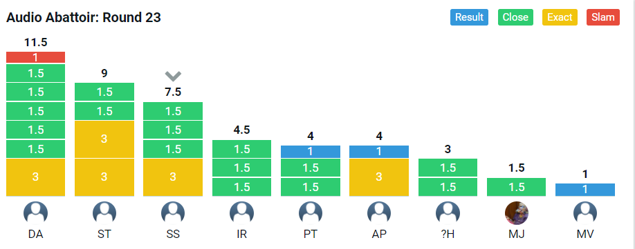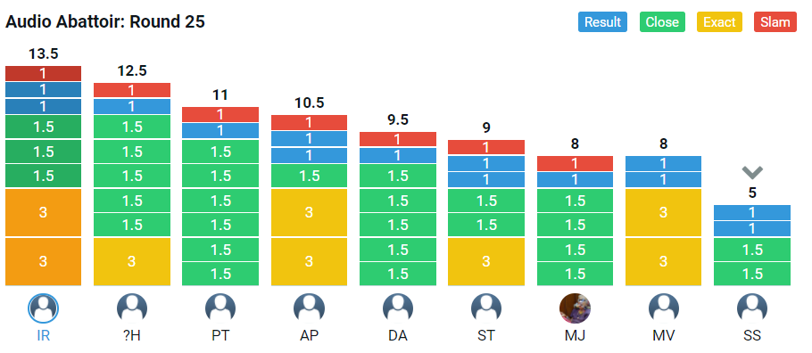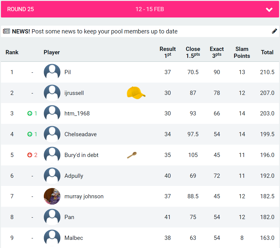 Round 25 results and @Ijrussell takes the win with 13.5 points, whilst @sjs picks up another wooden spoon with 5 points