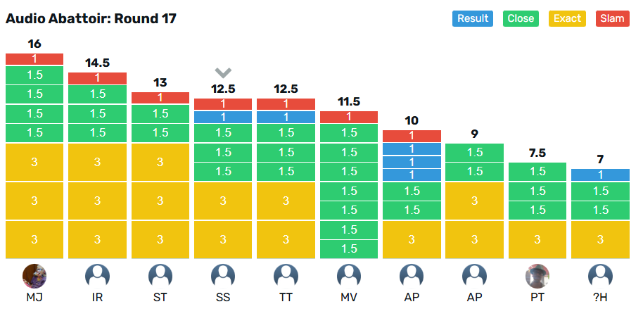 @murrayjohnson takes the crown for Round 17 with 16 points, from @Ijrussell on 14.5 points. @htm_1968 collects the wooden spoon on 7 points from @Pan on 7.5 points