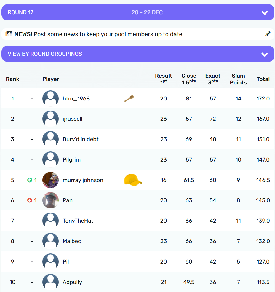 Overall, @htm_1968 remains out in front by 10 points from @Ijrussell, who is 10.5 points ahead of @sjs in third. @Adpully props up the table, 11 points from @stu