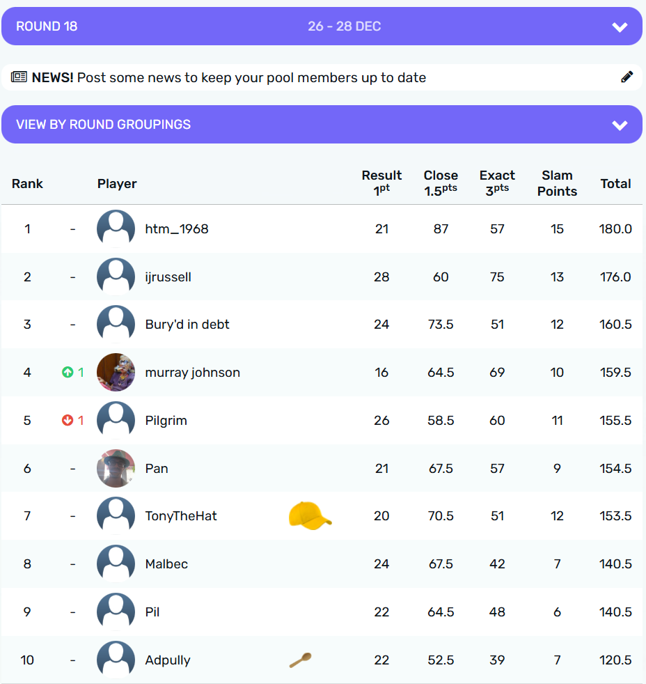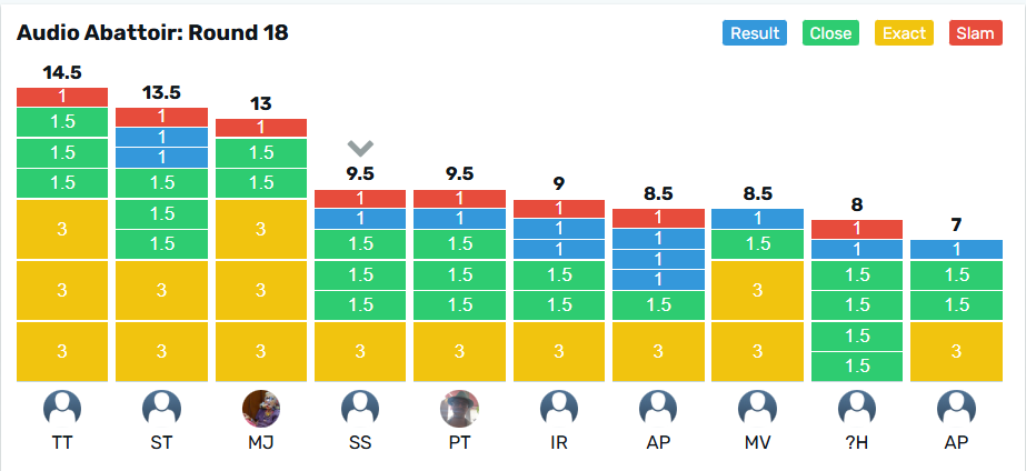 @TonyTheHat claims the crown for Round 18 with 14.5 points from @stu on 13.5 points. The wooden spoon goes to @Adpully on 7 points from @htm_1968 with 8 points.