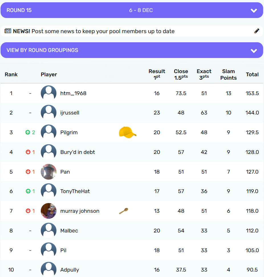 Round 15 crown goes to @Pilgrim with 11.5 points, from @Ijrussell on 10 points. The wooden spoon goes to @Adpully with a