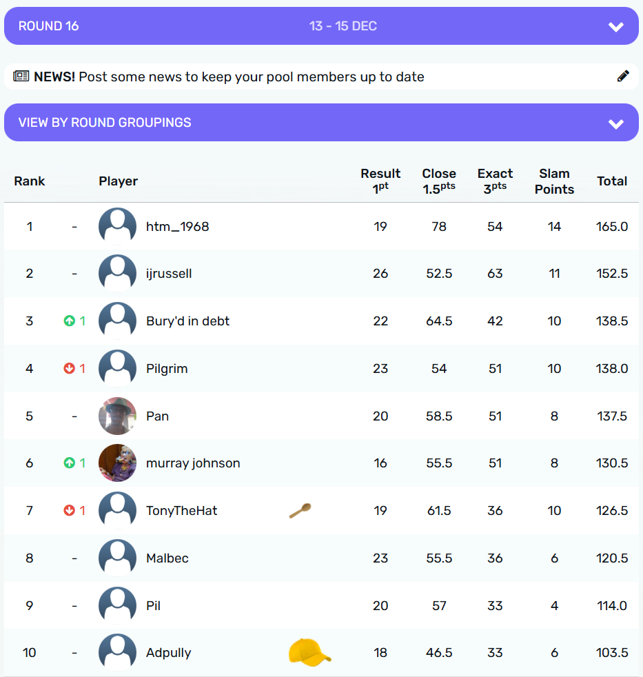 The crown for Round 16 was claimed by @Adpully with 13 points from @murrayjohnson on 12.5 points. The wooden spoon goes to @TonyTheHat on 7.5 points from @Pilgrim @malbec and @Ijrussell with 8.5 points
