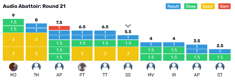 @murrayjohnson claims the crown for Round 21 with 9 points from @htm_1968 on 8 points. @stu collects the wooden spoon with 2.5 points from @Adpully with 3.5 points