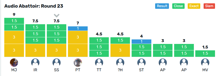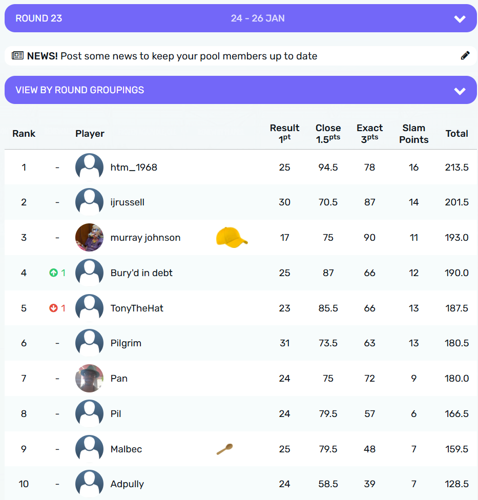 @murrayjohnson claims the crown for Round 23 with 9 points, from @Ijrussell and @sjs on 7.5 points. The wooden spoon goes to @malbec on 1.5 points, from @Adpully and @Pilgrim with 3 points.