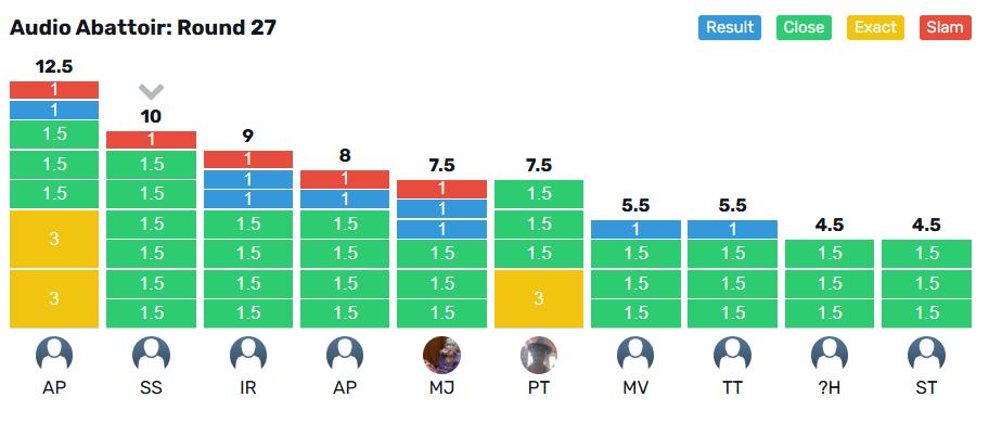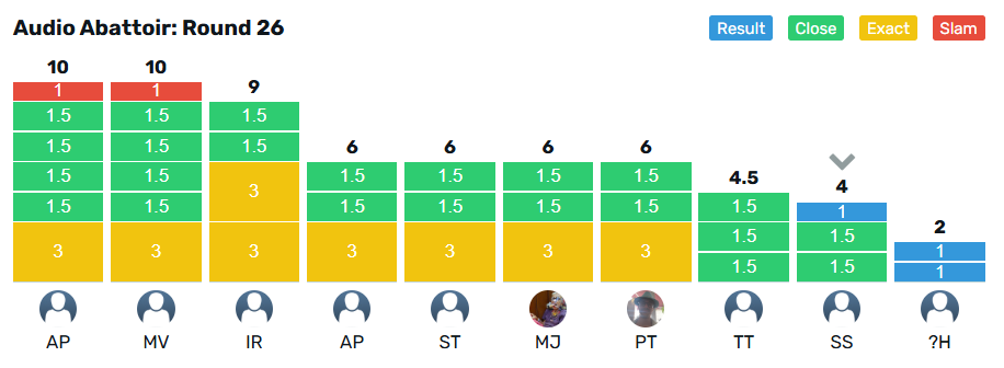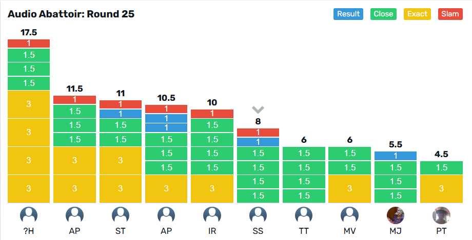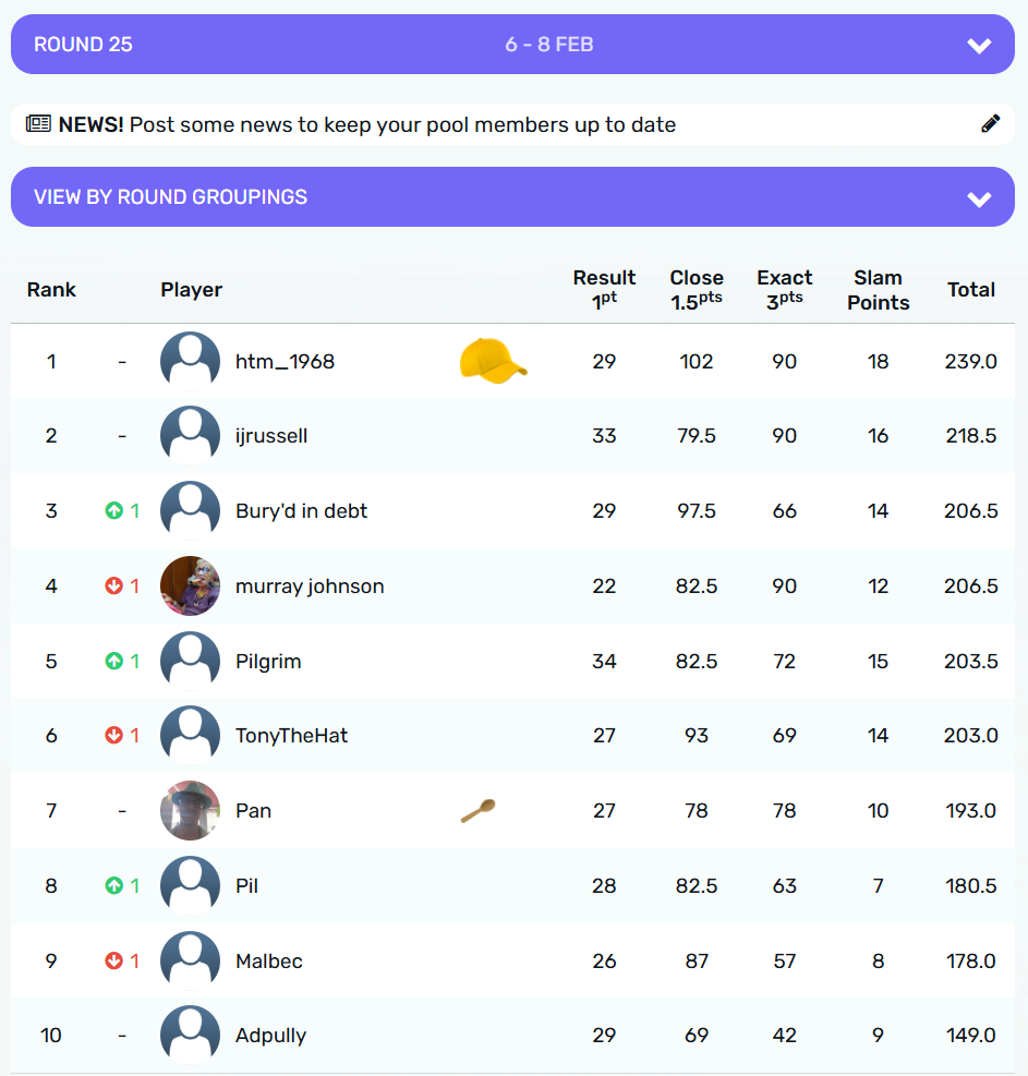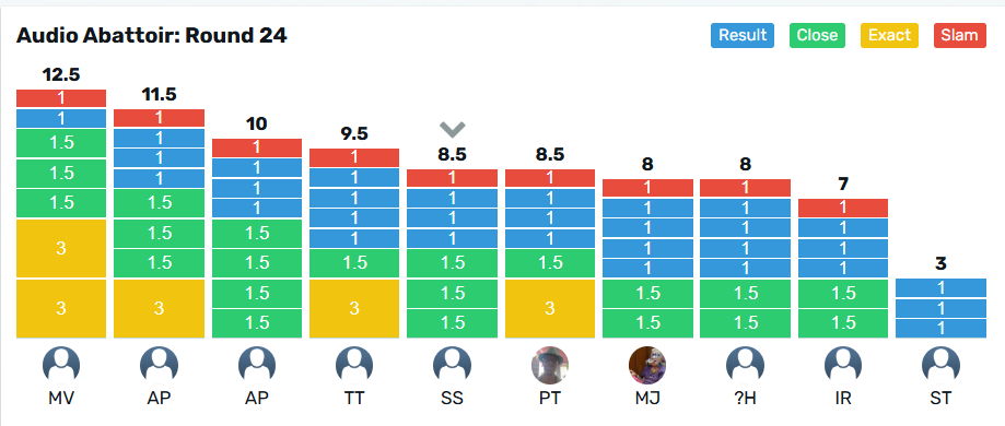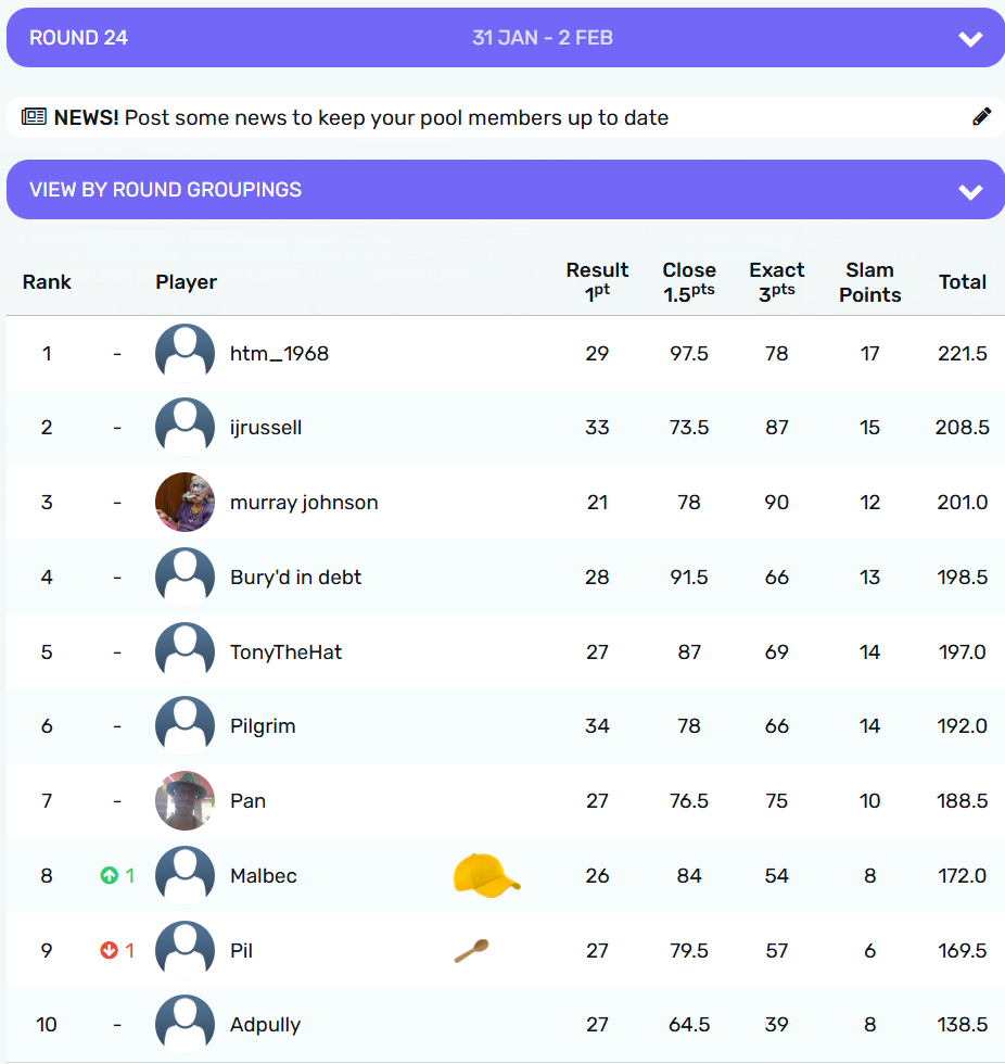 @malbec takes the crown for Round 24 with 12.5 points from @pilgrim on 11.5 points. The wooden spoon goes to @stu on 3 points, from @Ijrussell with 7 points.