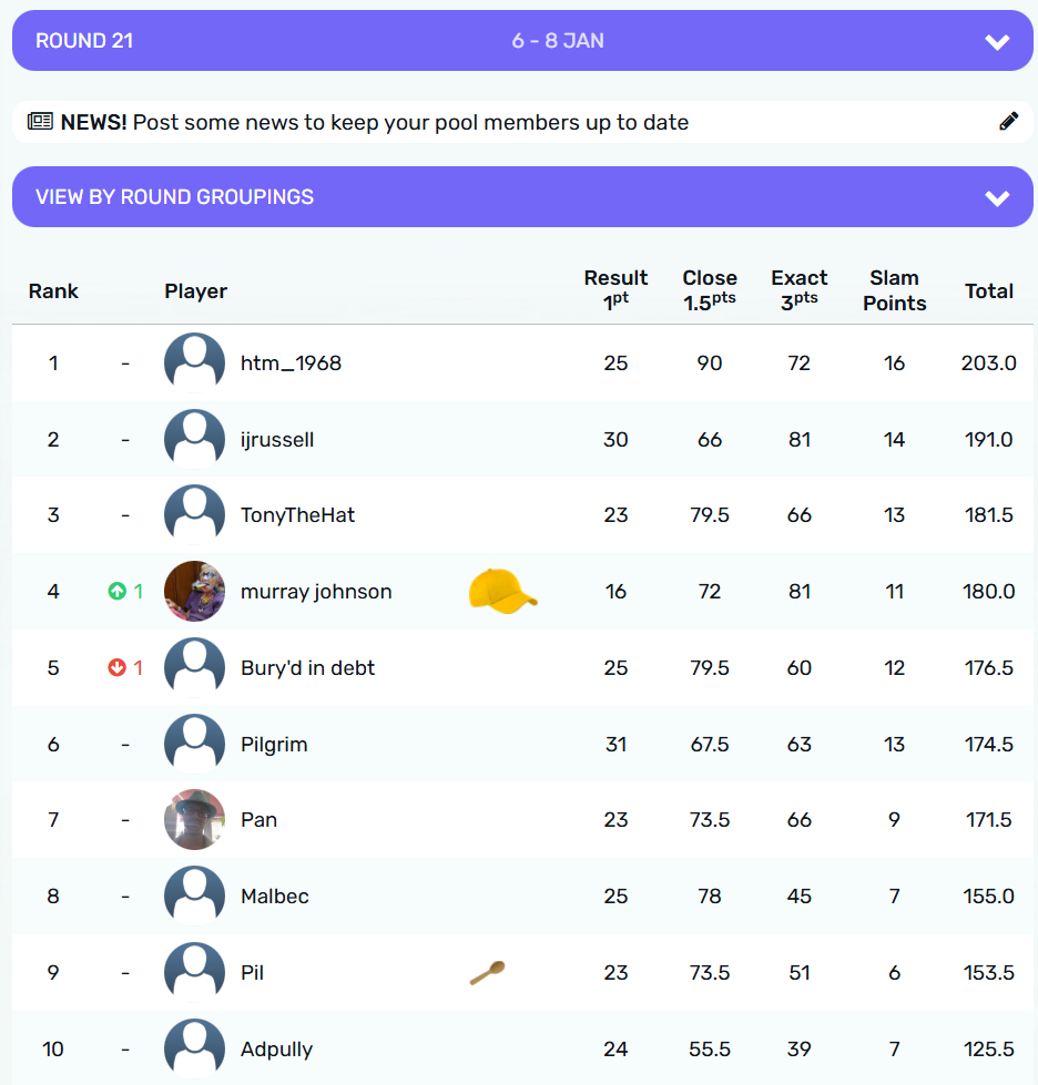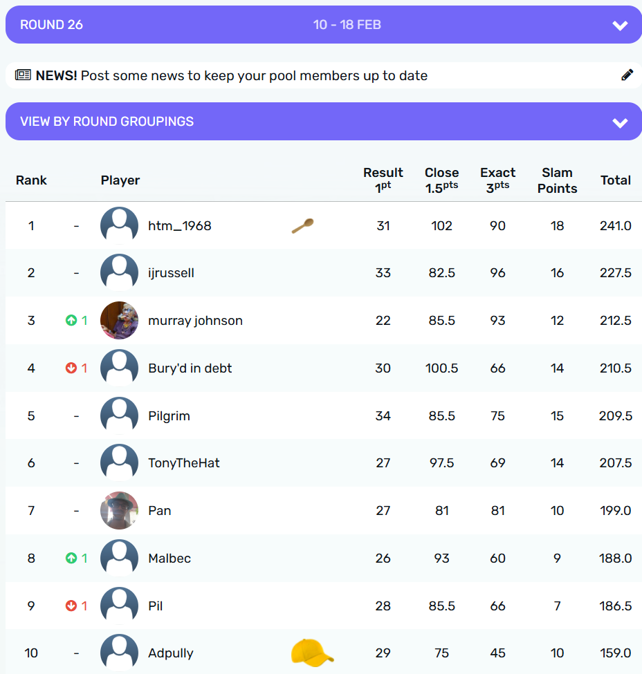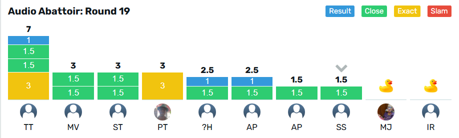 Round 19 was full of unexpected results, but @TonyTheHat takes the crown with 7 points from @malbec @stu and @Pan all on 3 points. @murrayjohnson and @Ijrussell share the wooden spoon with