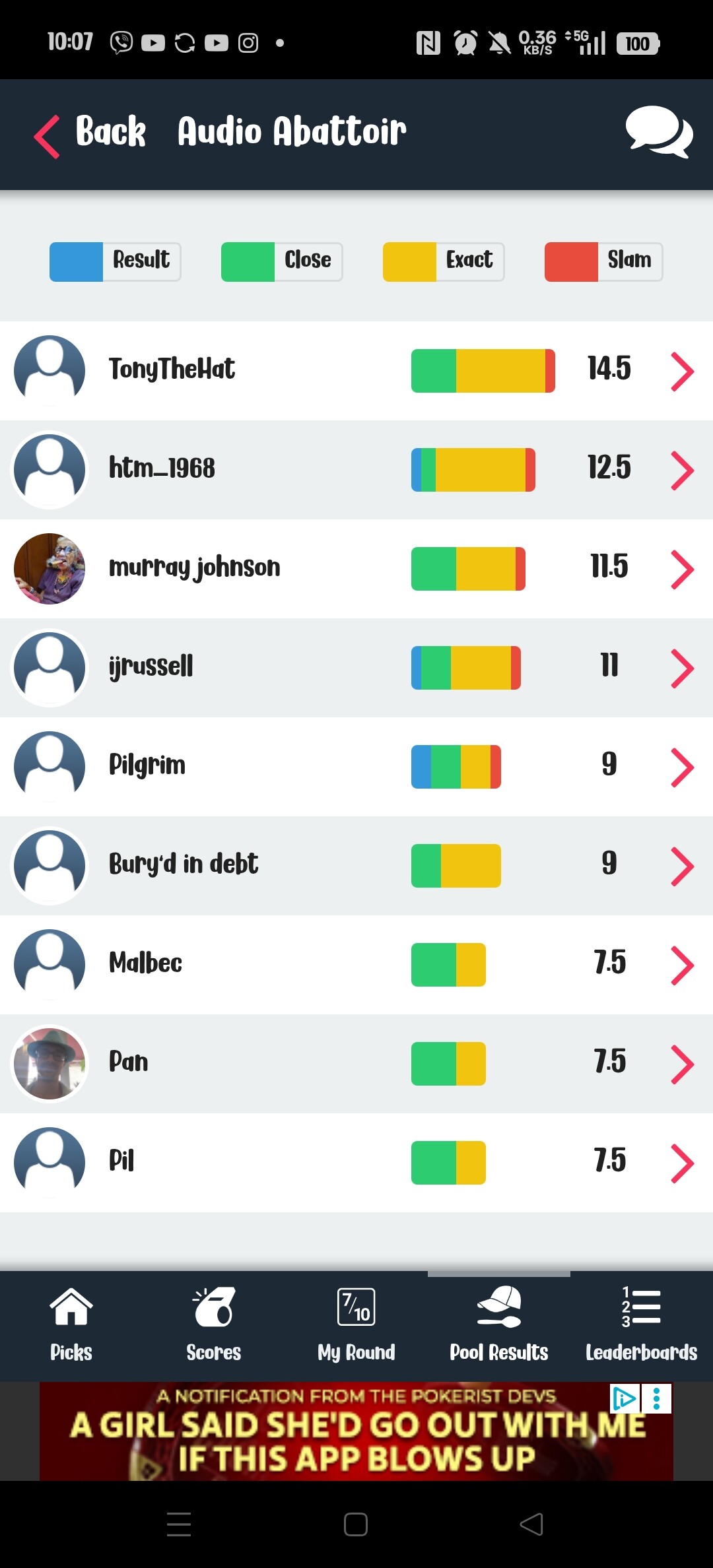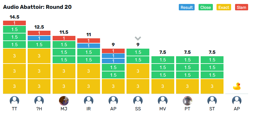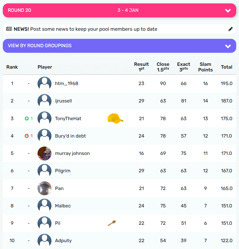 Round 20 crown goes to @TonyTheHat with 14.5 points from @htm_1968 on 12.5 points, while the wooden spoon is collected by @Adpully with a