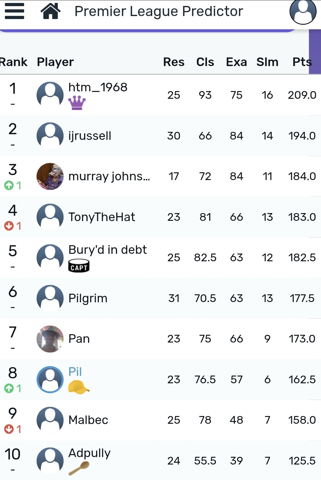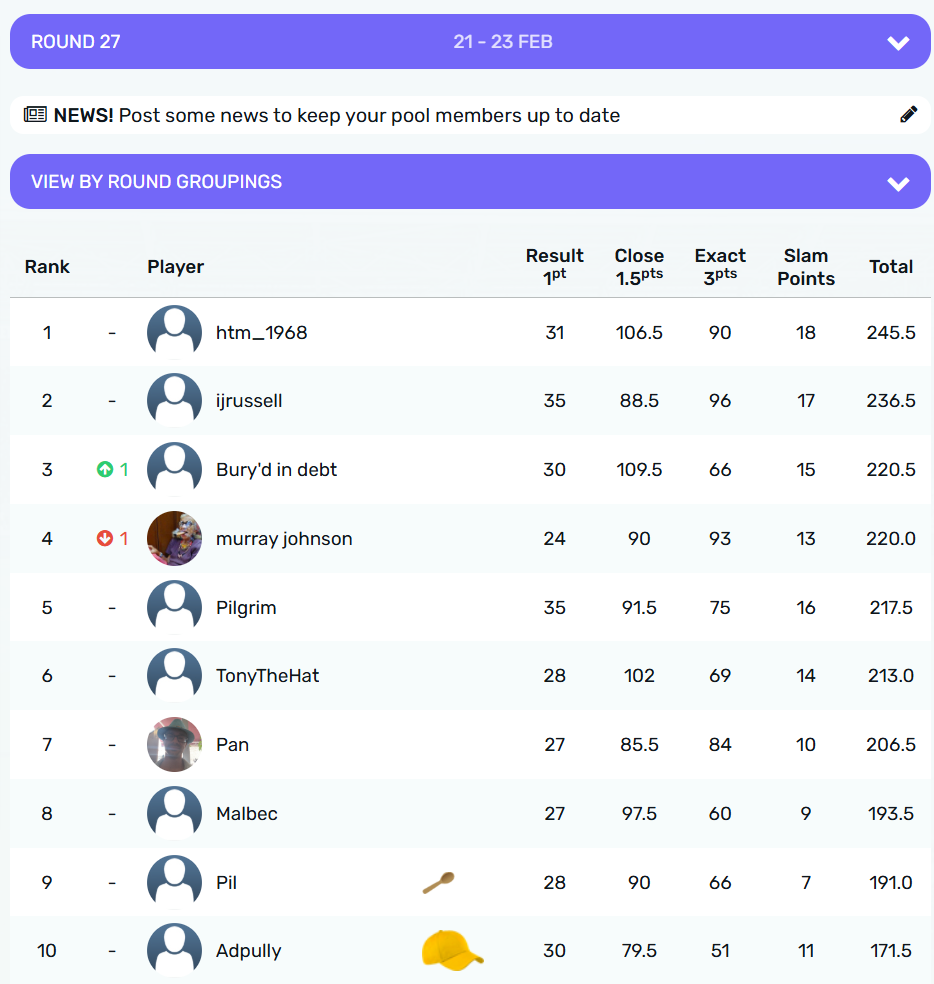 @htm_1968 remains top of the pile, 12 points above @Ijrussell in 2nd with @murrayjohnson a further 8.5 points back in 3rd. @sjs moves up one into 4th at the expense of @TonyTheHat, otherwise its as we were