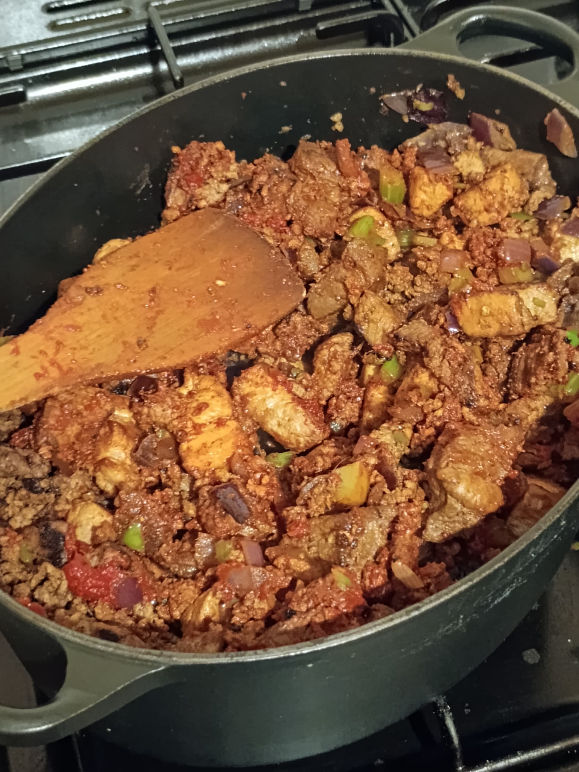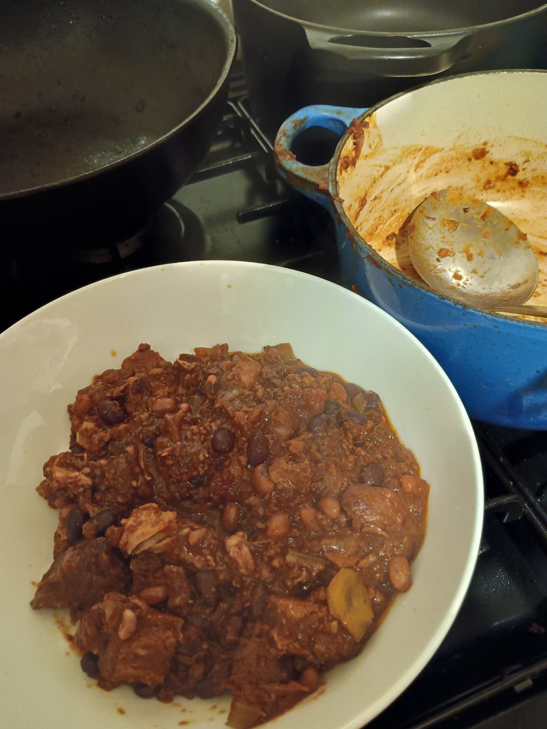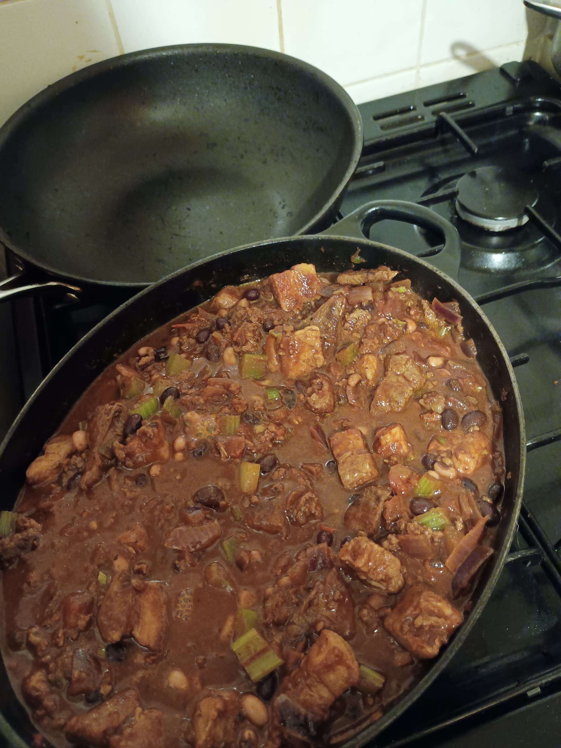 Le Crueset cast iron casserole pot now in tā oven (gas mark 3) wiv lid on fer at least several hours, when Iāll assess where its at. Sauce thicker than it looks at this stage, but did remember to drain the beans rather than just bung em in