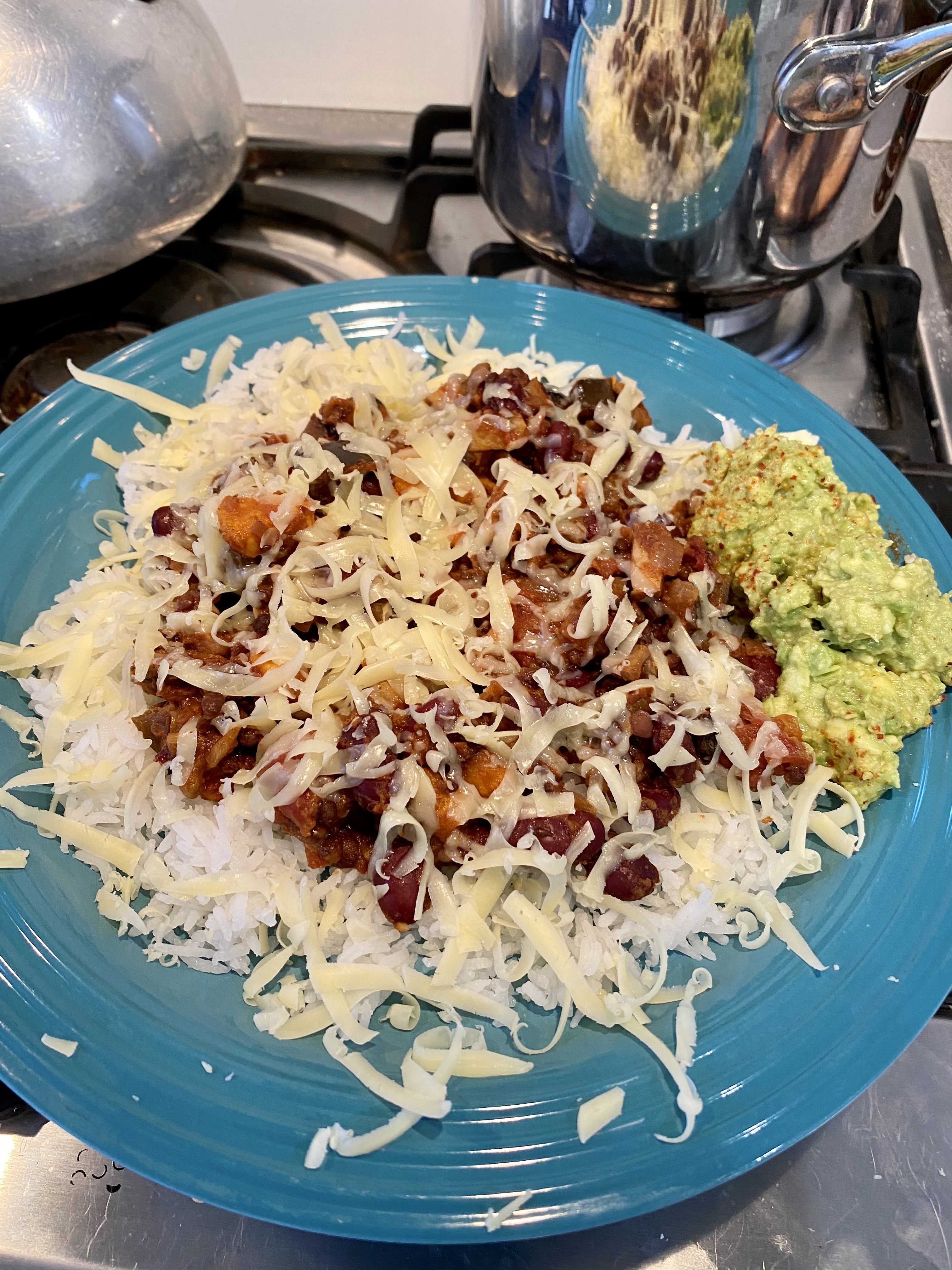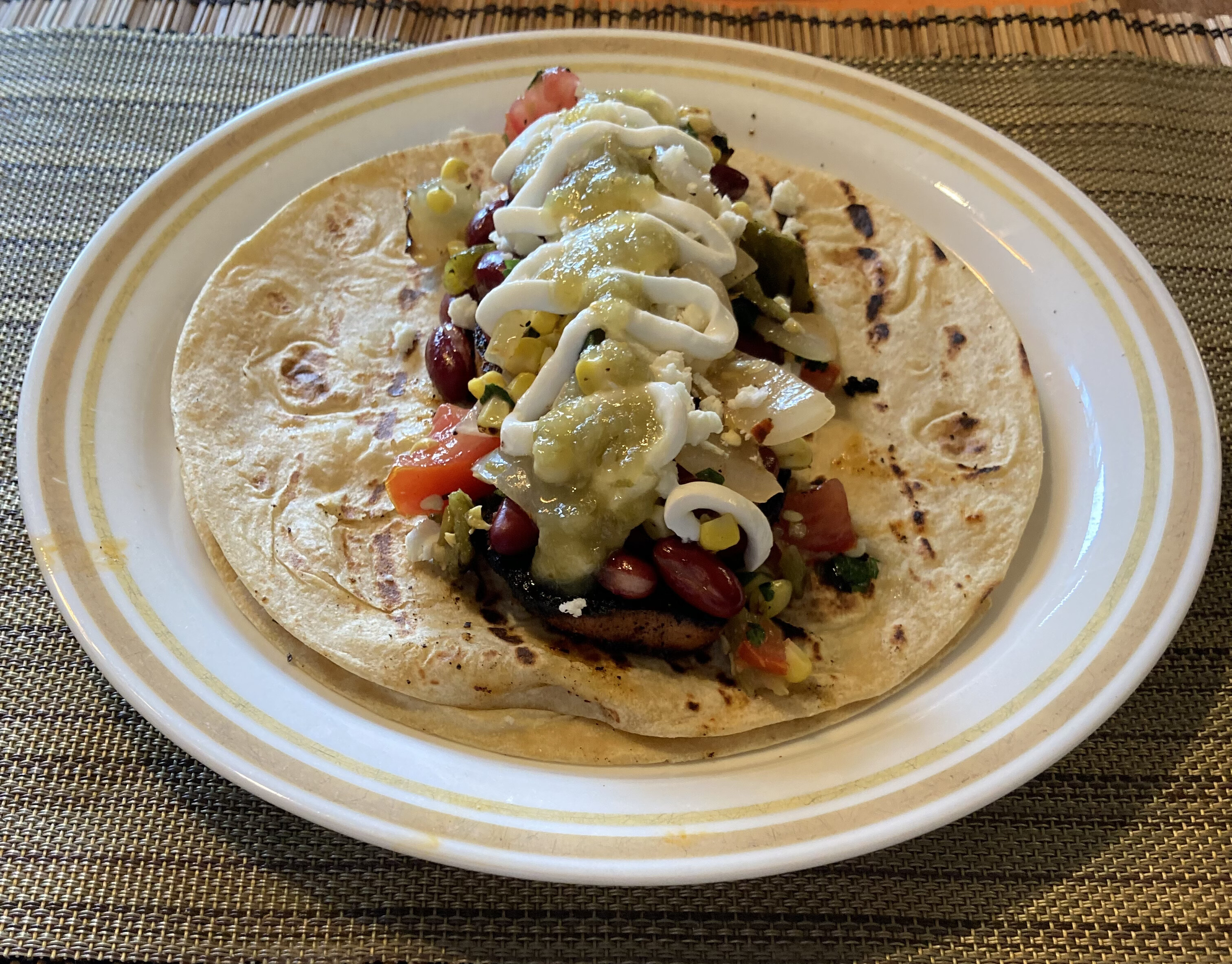 Grilled sweet potato and bean taco with grilled corn, onion, and jalapeño pico, cotija cheese, Greek yogurt, and green salsa. The shell is two flour tortillas stuffed with shredded cheese and warmed on the grille.