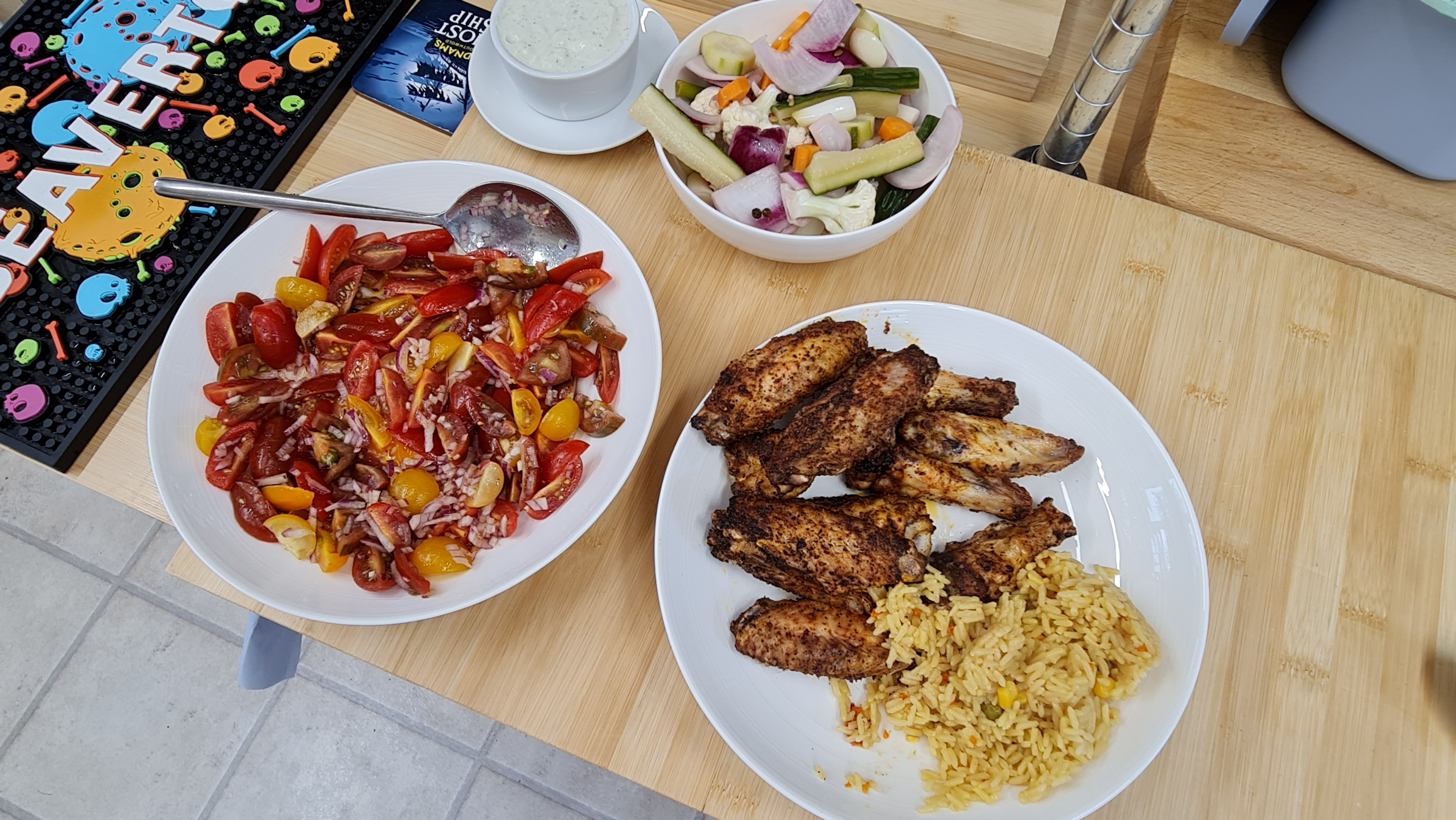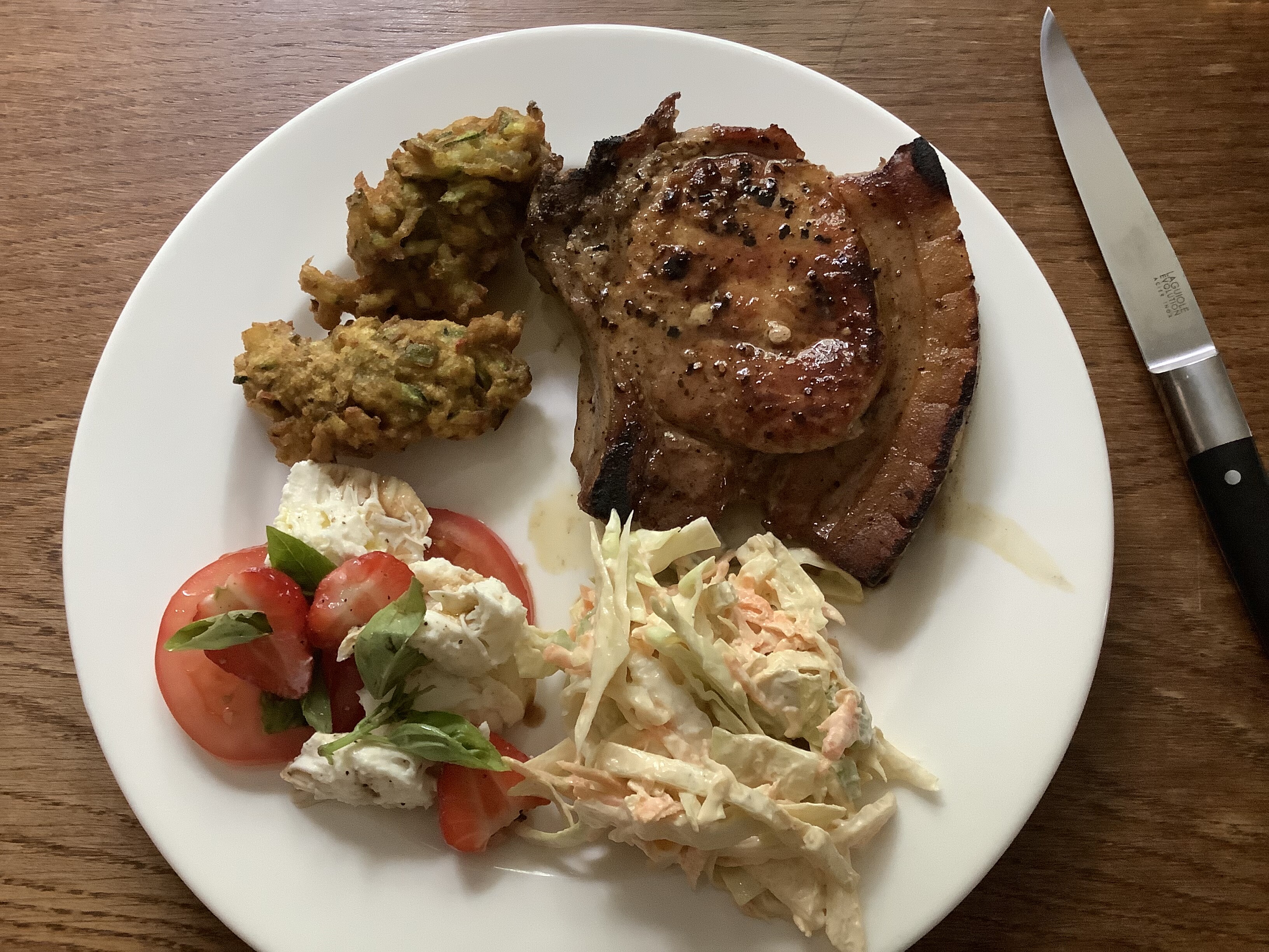 BBQ’d pork chop, homegrown courgette pakora, coleslaw, and tomato, strawberry, mozzarella, basil, balsamic salad.