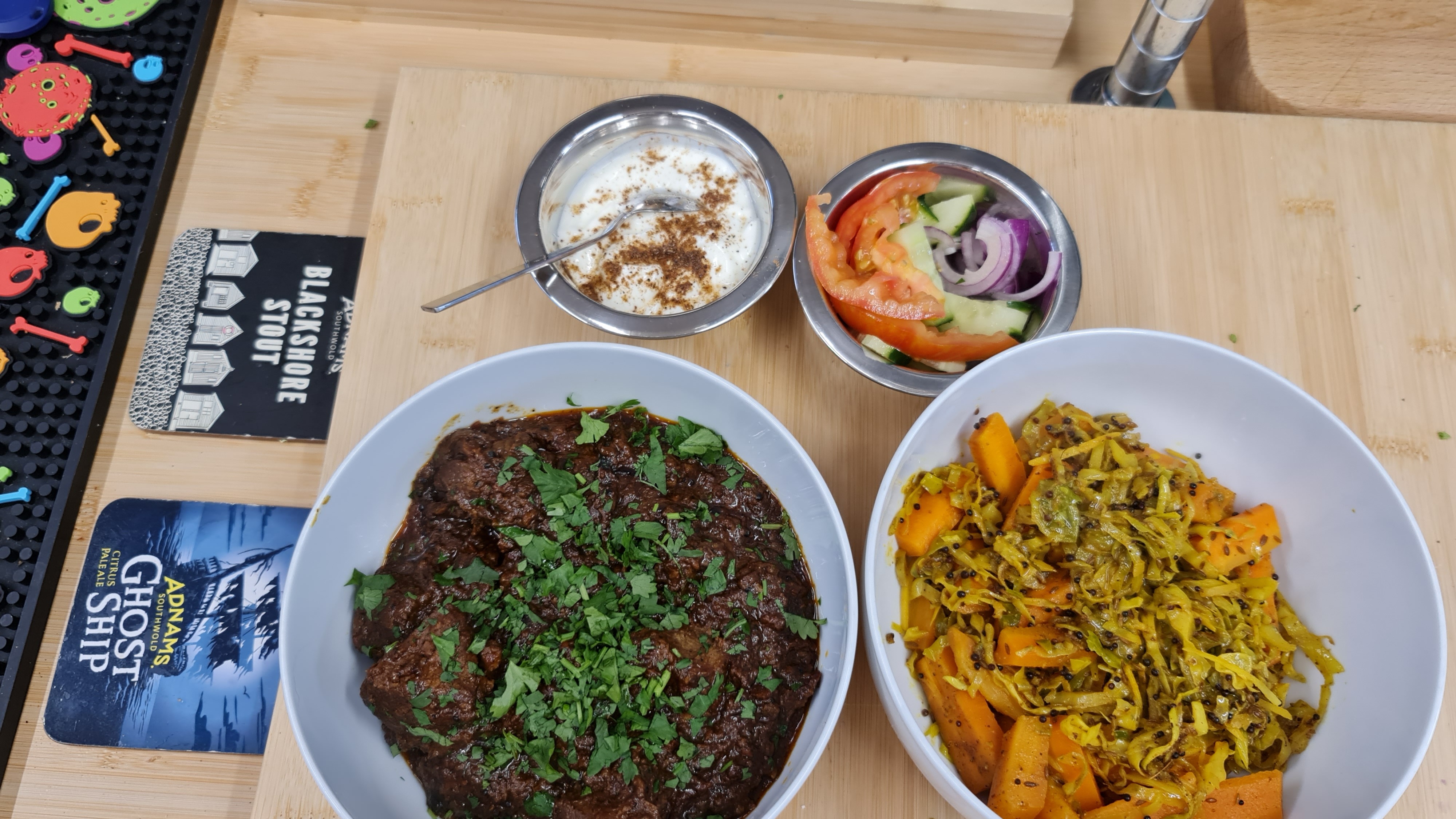 Mutton pepper fry (from the Dishoom book) and a dry curry of carrot and cabbage