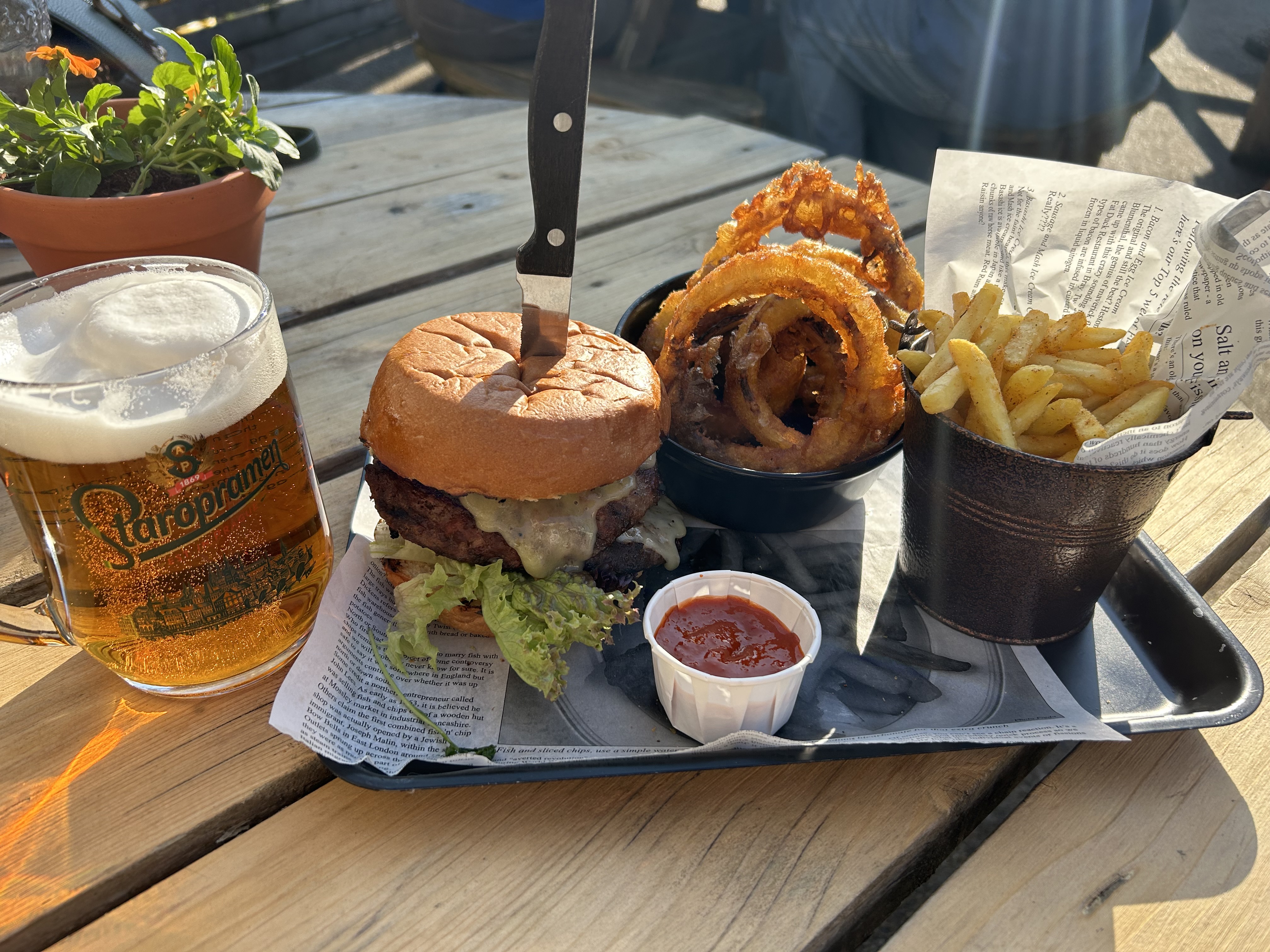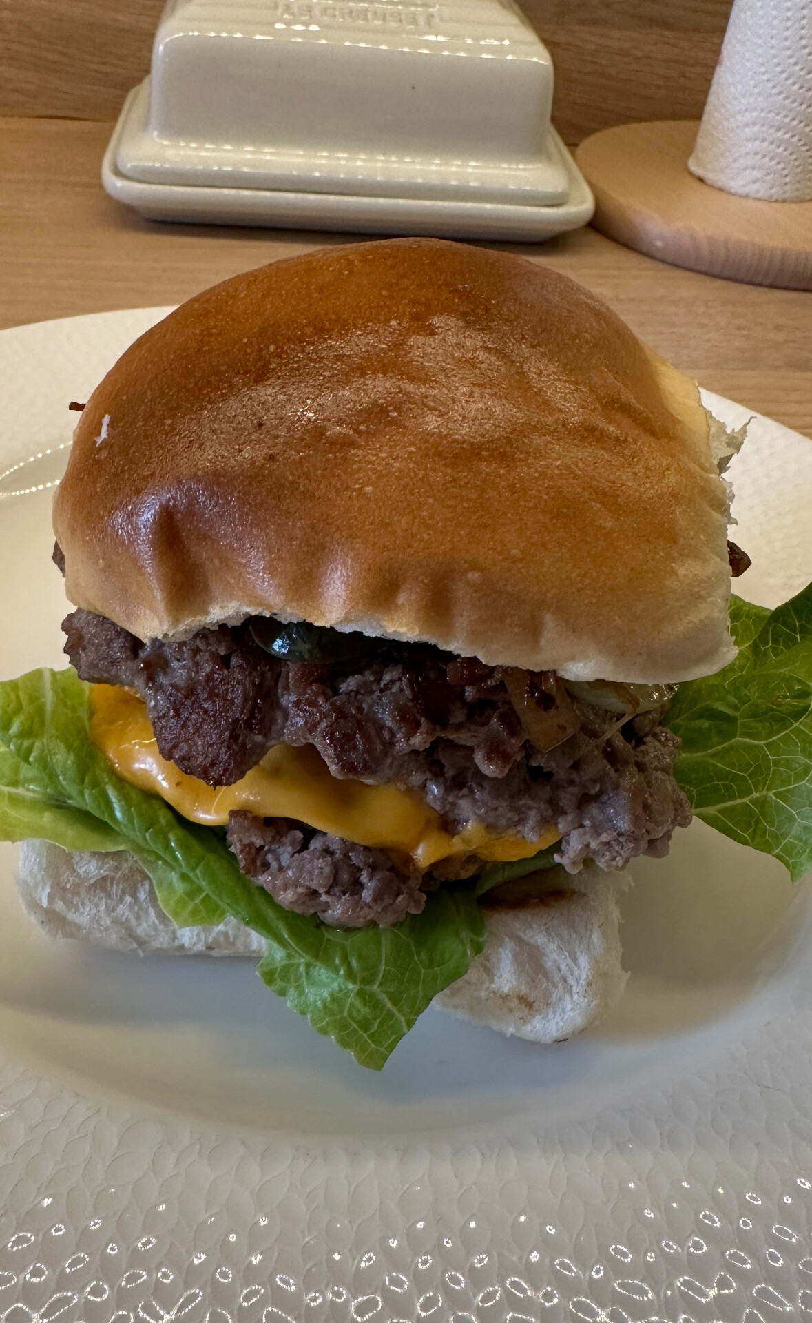 Three stack smash burger, with fried onions, cheese, chilli jam and pickle. On milk bun.