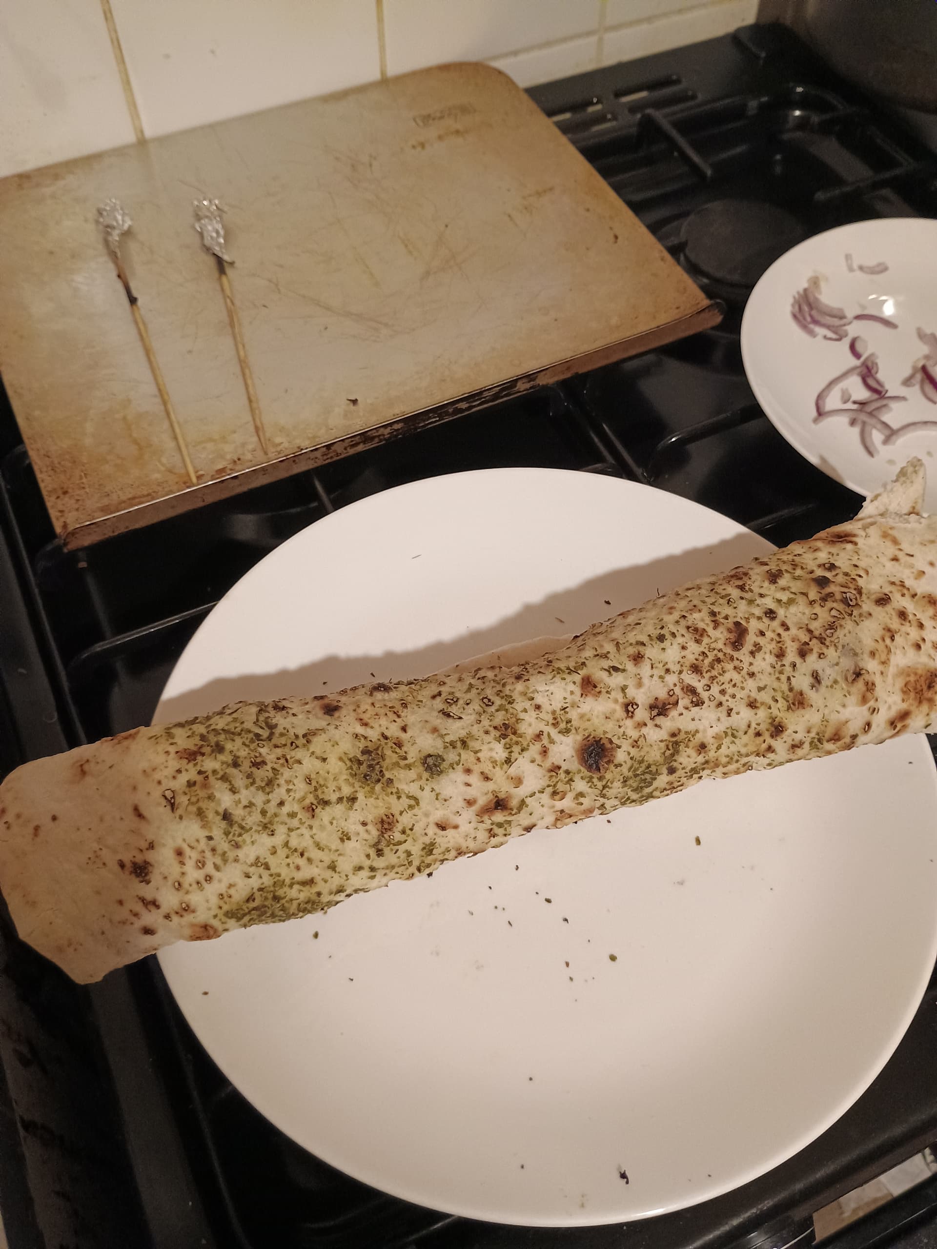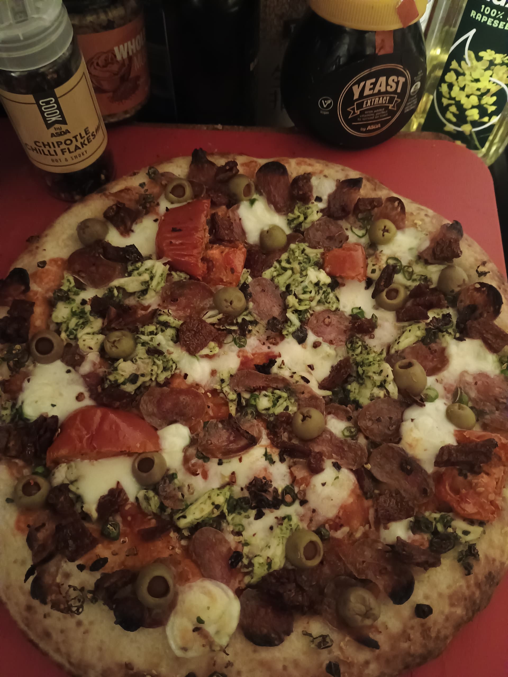 Sourdough pizza with pesto chicken, Fuet Iberico, sun dried 'n sun blushed tomatoes, pimento stuffed olives, finely sliced green chillies & a sprinkling of dried smoky chipotle flakes & mozzarella.