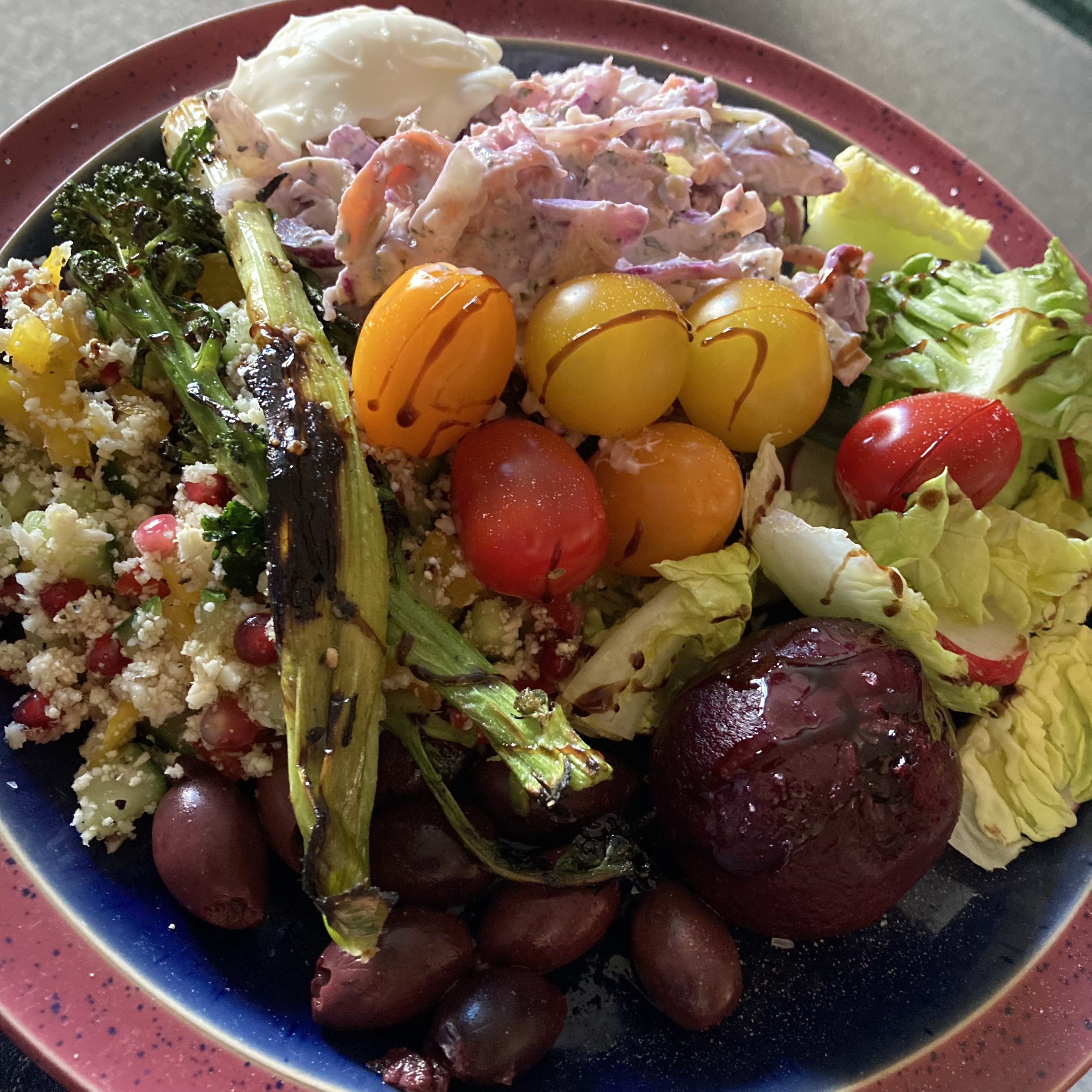 BBQ’d Barnsley Chop, smokey, BBQ blackened Aubergine Baba Ganoush, Tsadziki, and new season asparagus.