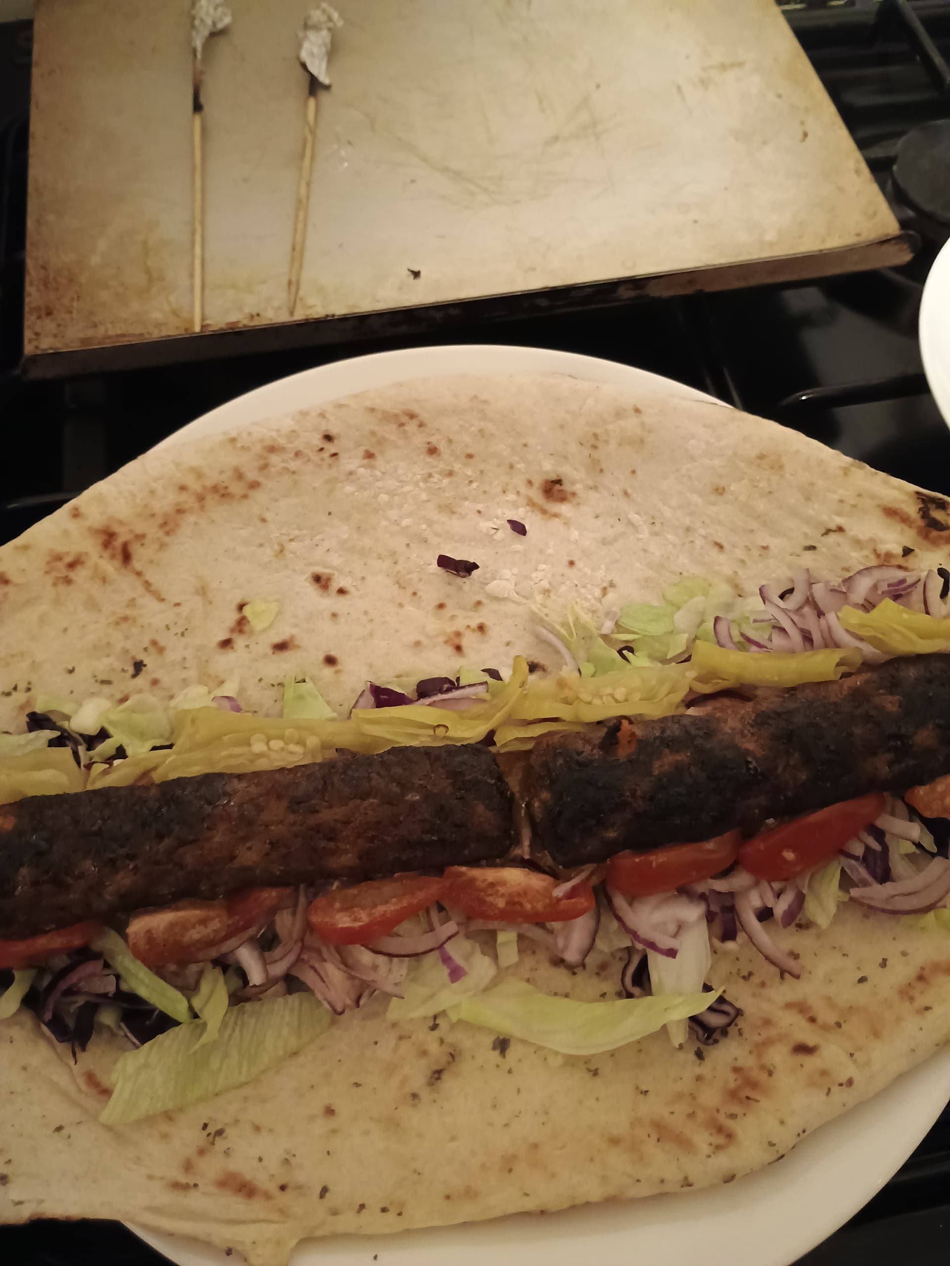 & coriander naan. Bed of finely shredded red & tenderheart cabbage + Romaine lettuce & quarter sliced 'n separated red onion + homemade raita. Grilled lamb seekh kebabs (quarter pound each), quarter sliced baby plum tomatoes, pickled chillies, spicy mango & apricot dressing + Naga sriracha sauce.