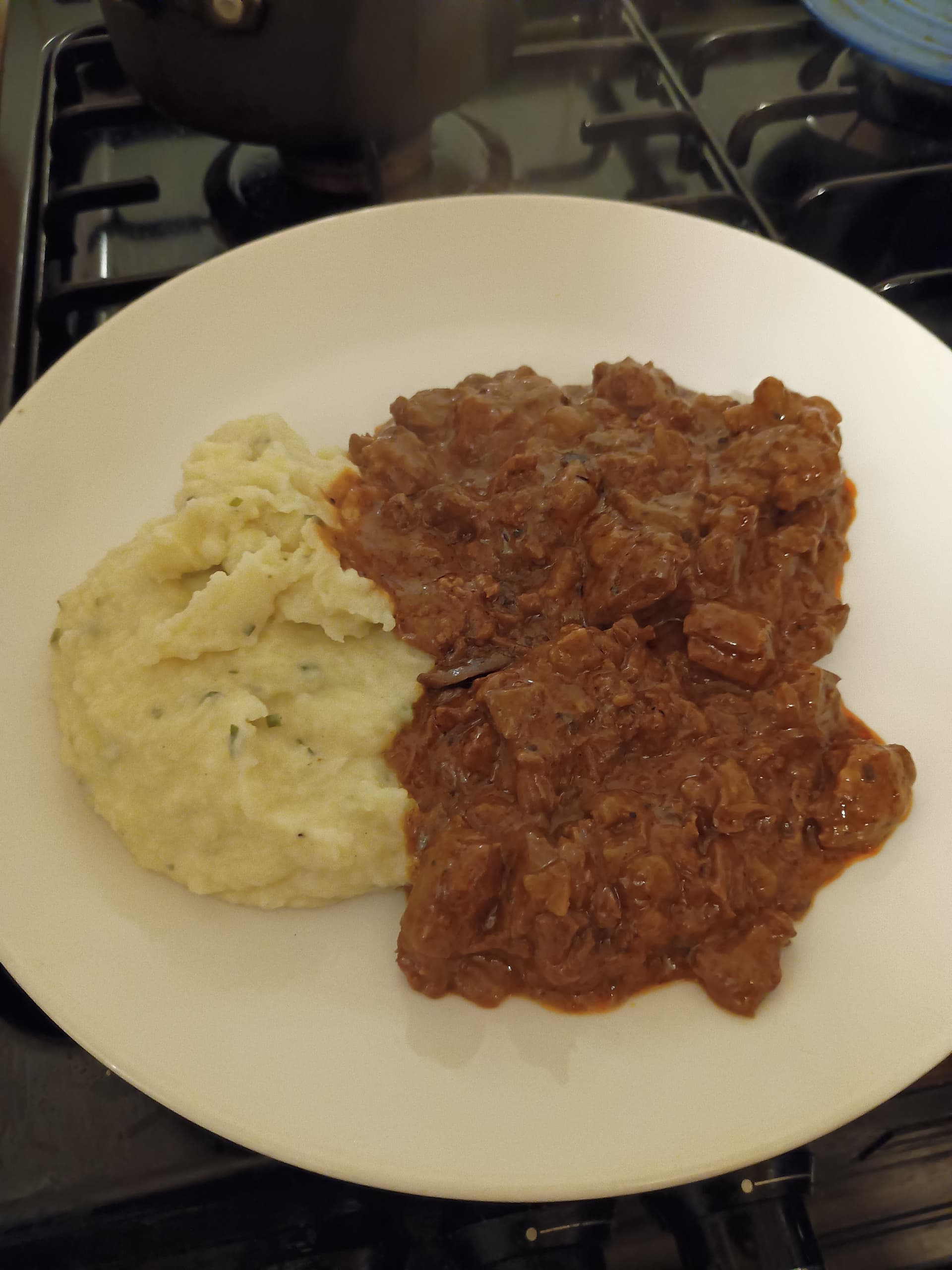 Beef Stroganoff mit creamy mash with roasted garlic, butter, crème fraiche, white pepper sea salt ‘n chives.