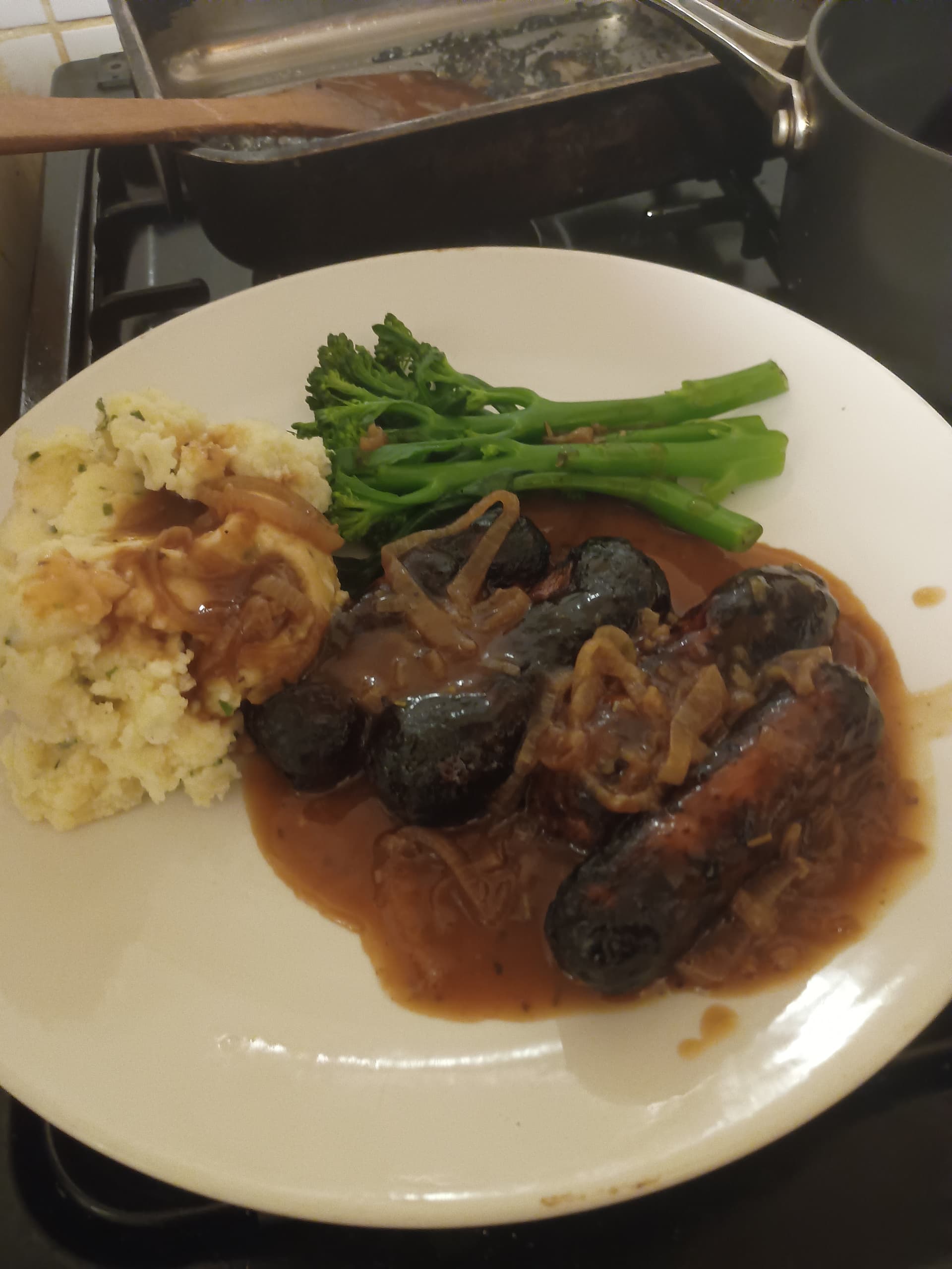 crème fraiche, butter & plenty of chives ‘n white pepper + a little sea salt. Echallion shallots & cider gravy with chicken stock. Tenderstem broccoli steamed.