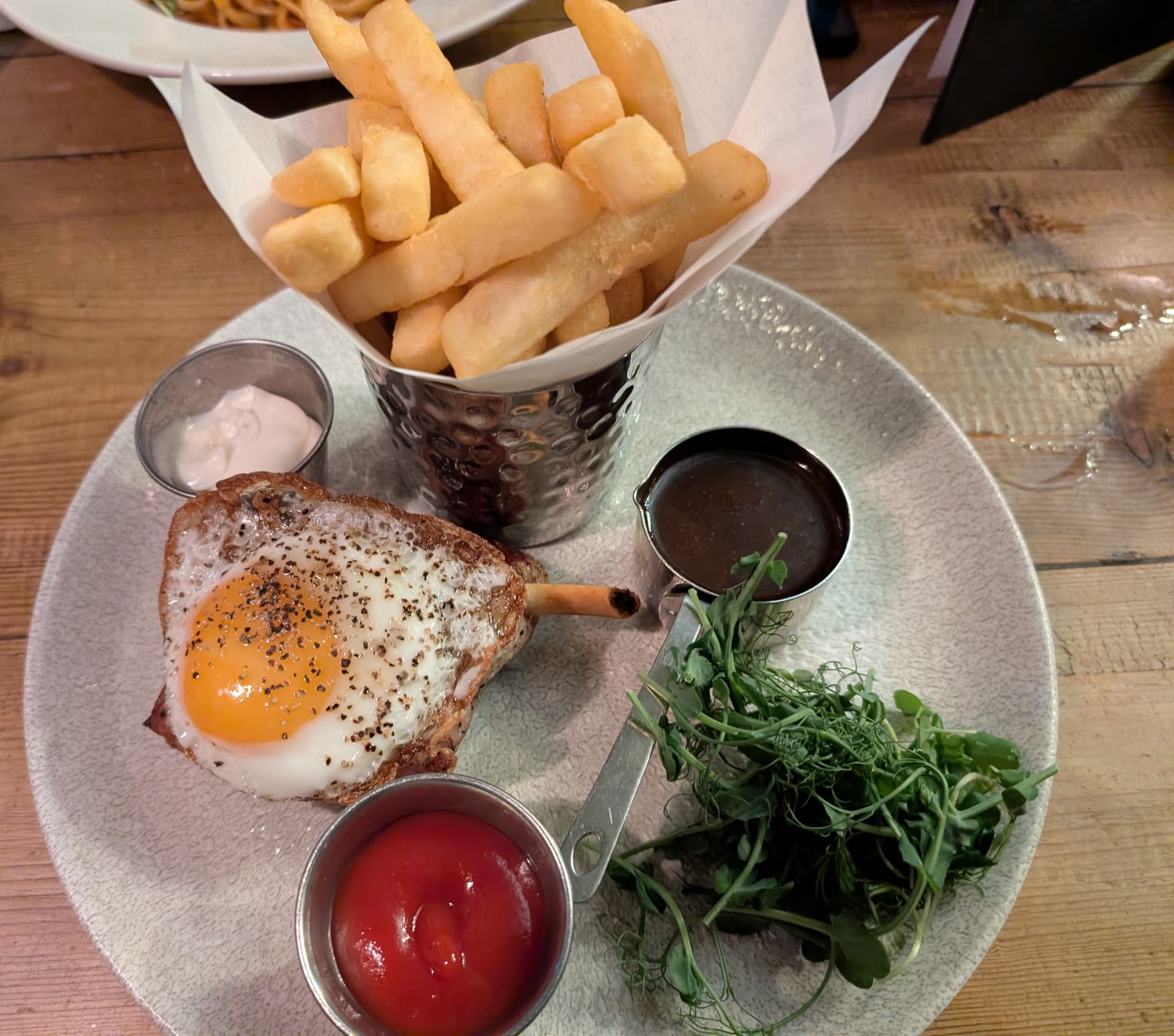 Ham (very good, sadly obscured by the) egg and chips at a local pub before the residents association meeting (stitch ‘n’ bitch).