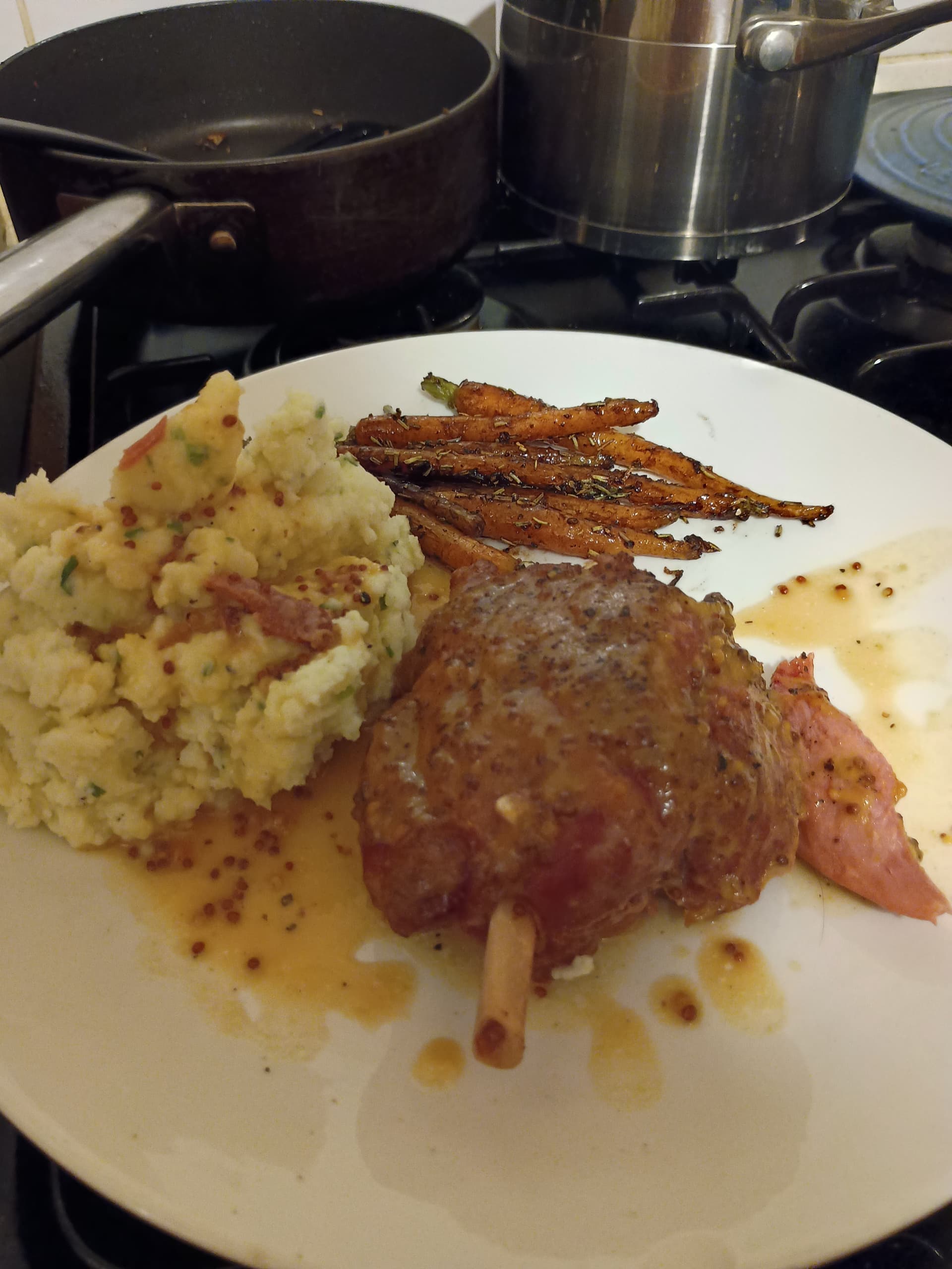 honey & mustard glaze. Served with creamy mash with crème fraiche, butter, slow roasted garlic with chives ‘n plenty o’ white pepper + a little sea salt. Caramelised tendersweet carrots sautéed in butter with cracked black