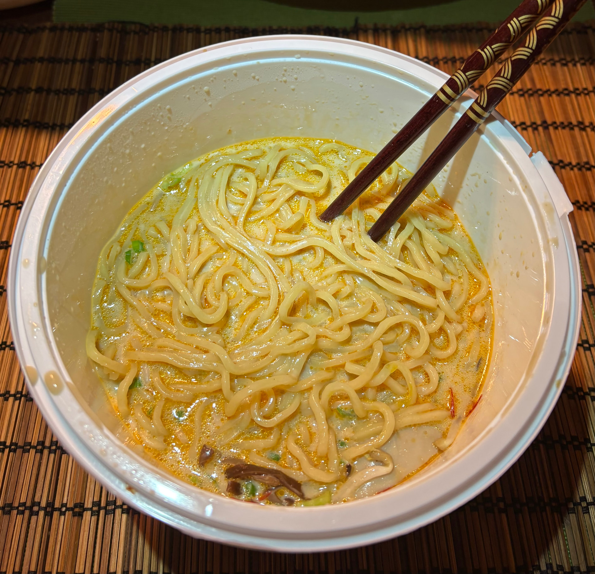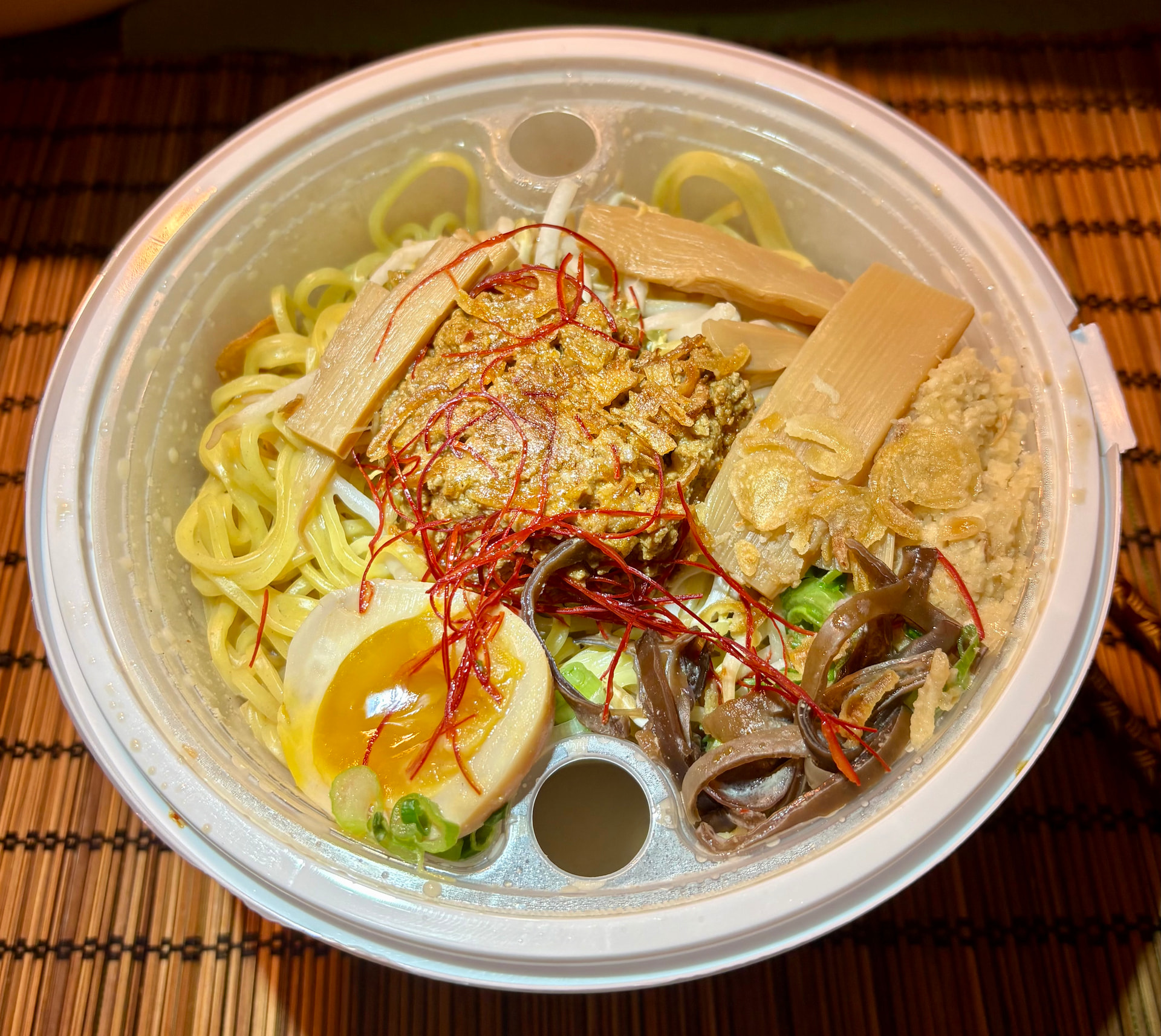 Thick noodles with seasoned minced pork, marinated egg, bean sprouts, scallion, bamboo shoot, wood ear mushroom, chili oil, shredded chili, white pepper, and crispy fried onion. I had a blob of raw grated garlic as an addition.