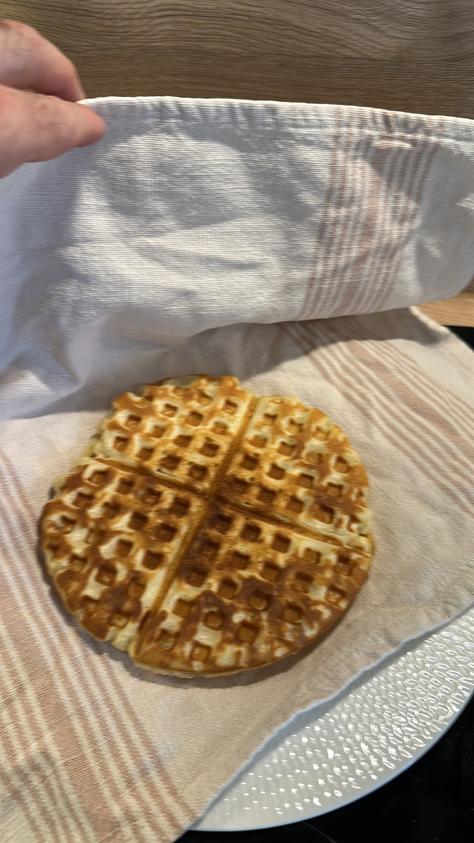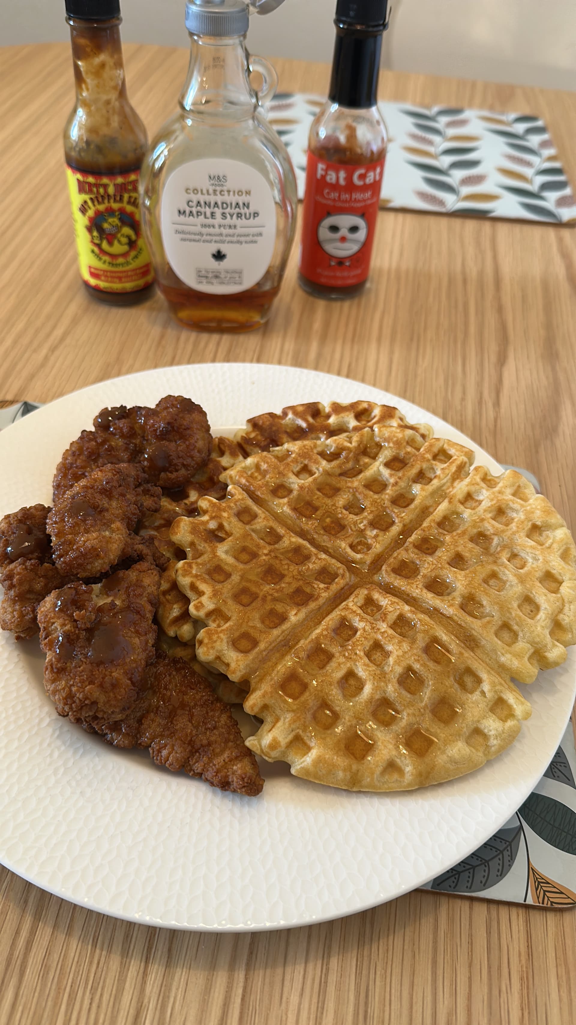 Made waffles and chicken, with some maple syrup and hot sauce!