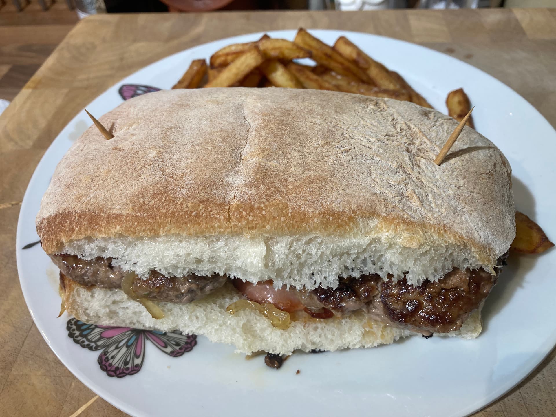 Two 6oz chilli burgers, four slices of smoked bacon and fried onions in a home-made roll.