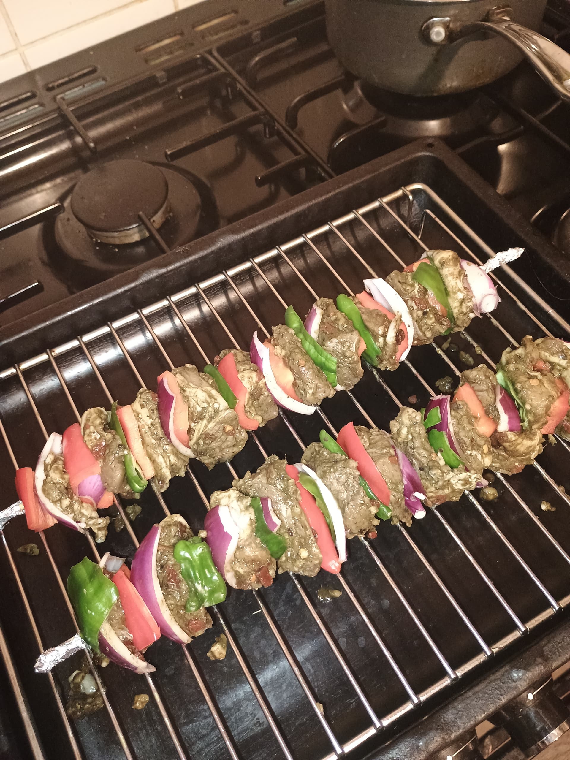 Lamb rump steak kebabs assembled & coming up ter room temp prior to grilling. After a 24 hr+ marination in a spicy Bombay coriander 'n mint marinade, skewered with red onions, Padron peppers and pointed red peppers.