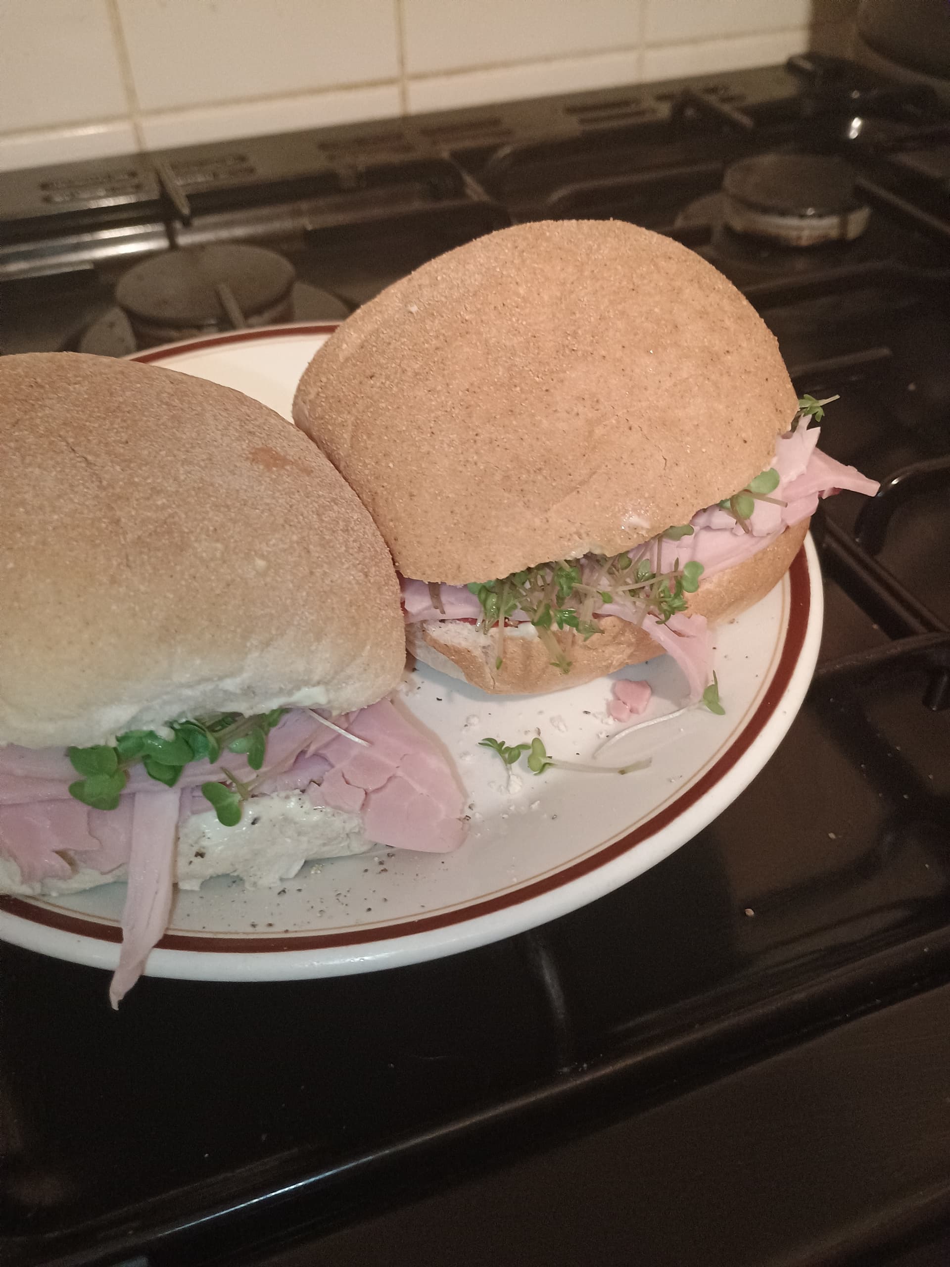 Buttered Scotch rolls, thinly sliced vine ripened tomatoes, cured ham on the bone, salad cress 'n Dijon mustard.