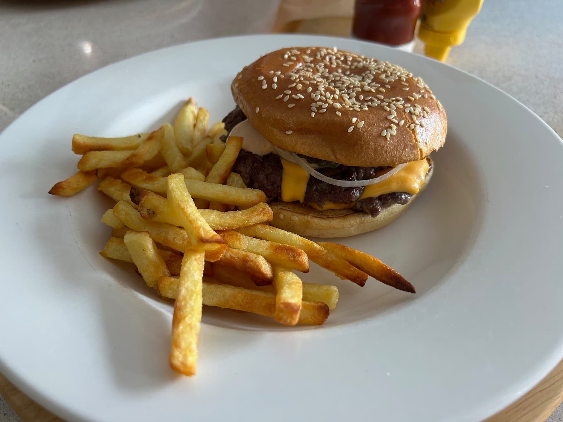 Double stack cheese, smash burger, with raw onion, gherkin and homemade chilli mayo. Bloody scrumptious!