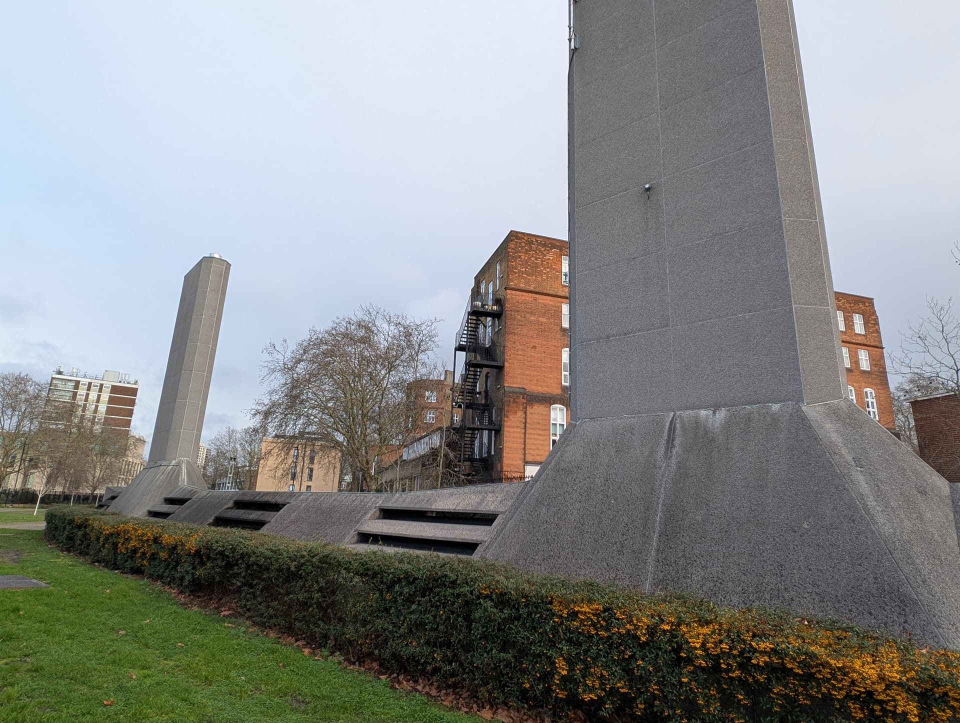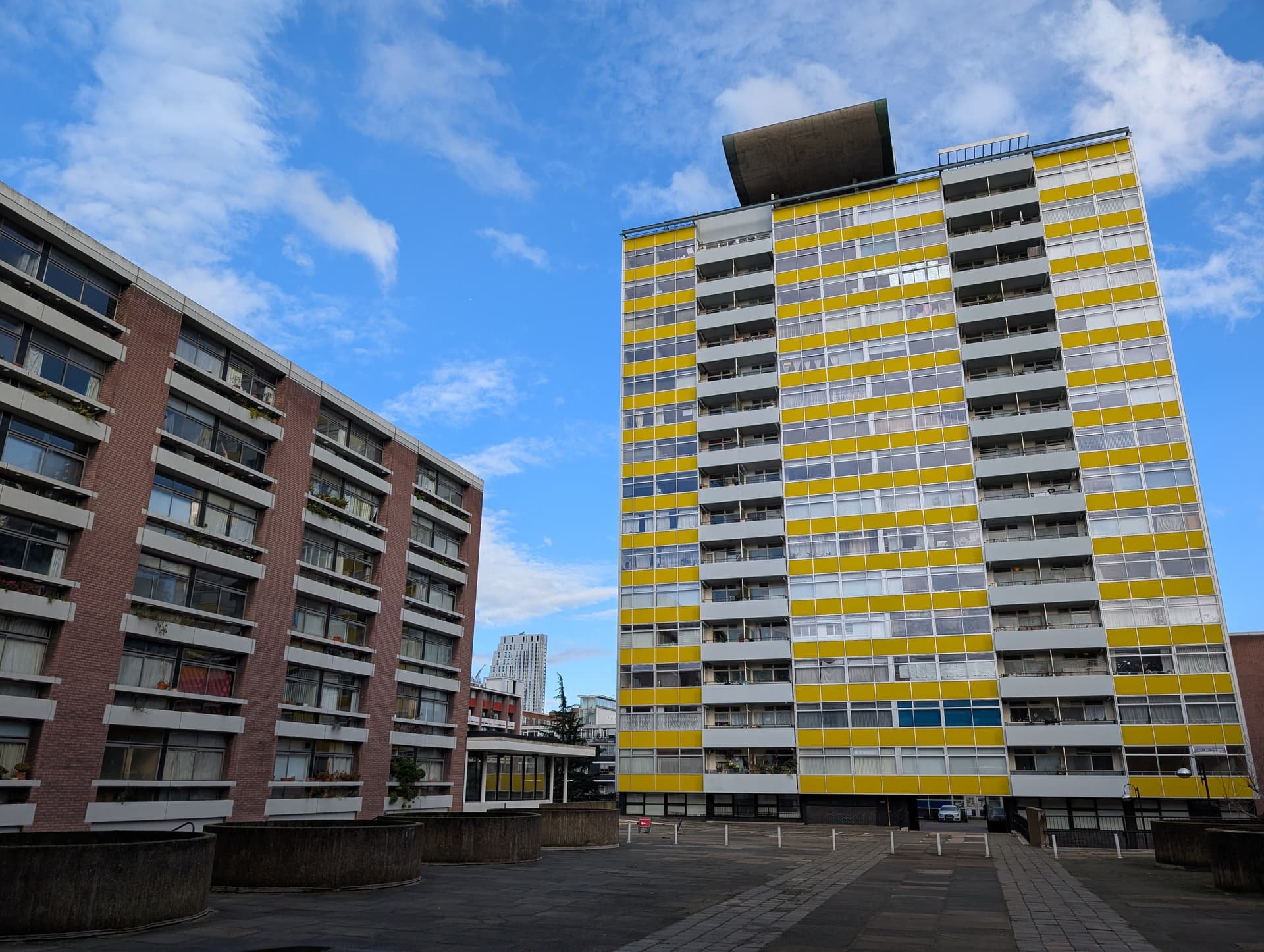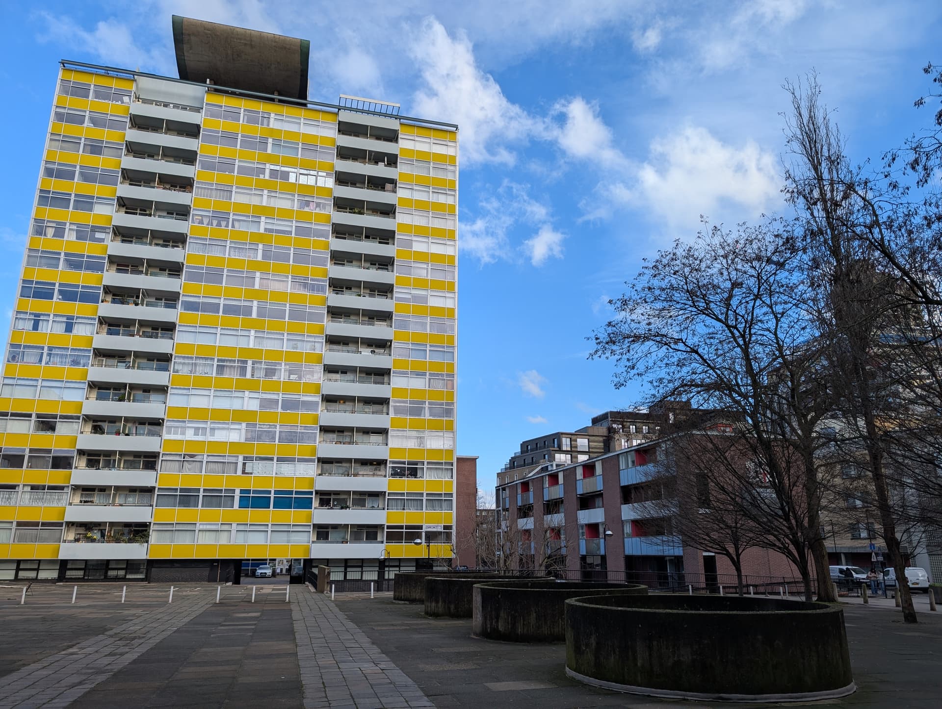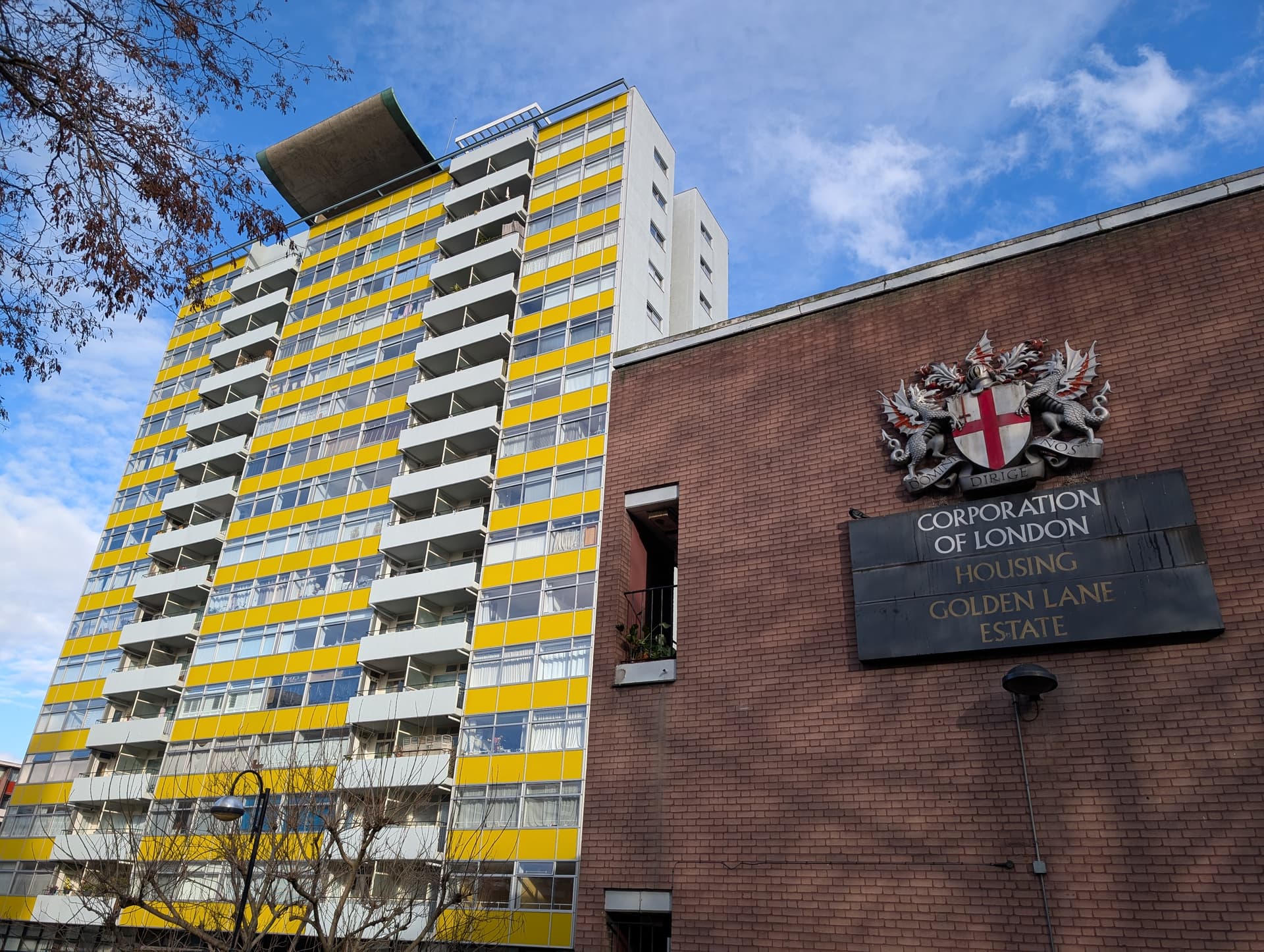 I happened to be walking past today, so here’s (some of) the proto-Barbican Golden Lane Estate. Chamberlin, Powell and Bon, 50s.