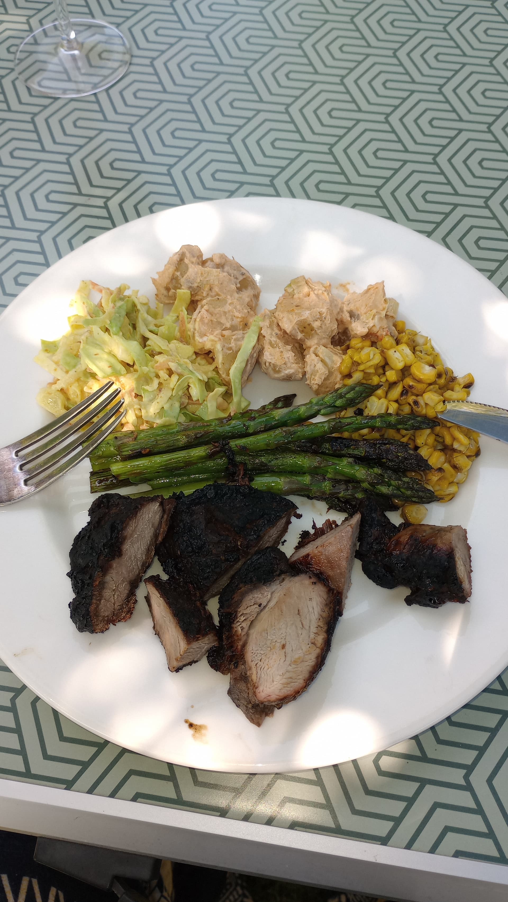 Lamb leg, deboned and butterflied, dry rub of pimenton, garlic powder, lemon zest, oregano, and coriander, cooked for 4 hours at 100 degs. Basted every 30 mins with olive oil, lemon, and garlic. Rest for 1.5 hours…