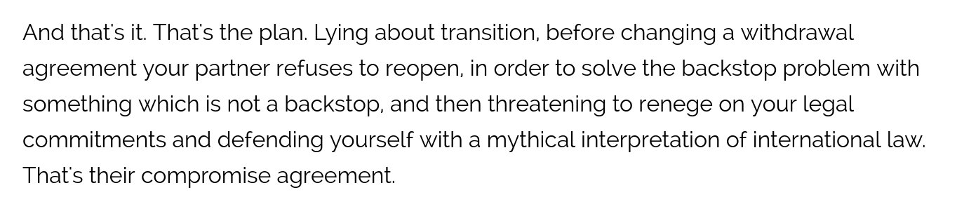 In short, the decision walk on the GFA, or our obligations to the EU, should have serious implications for the long-term credibility of all future UK negotiations, which is inconvenient when we appear to have decided to renegotiate the vast bulk of our trading arrangements.