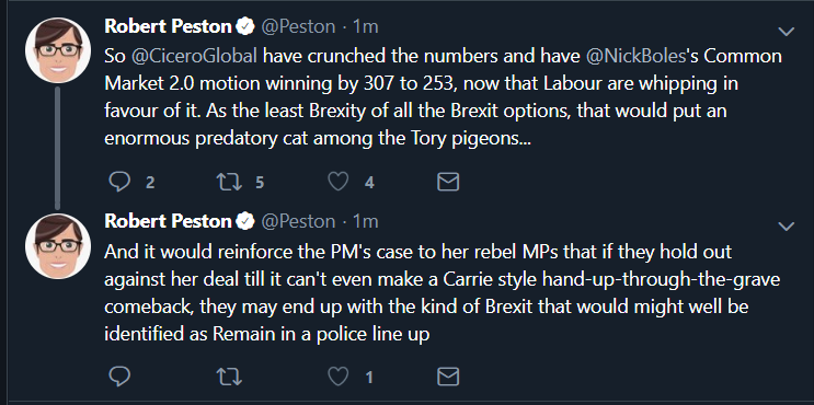 Labour seem to be whipping for everything. Be interesting to see how many rebel. Doesn’t Common Market 2.0 (fucking stupid name) allow for free movement? It is also a unicornish around the edges as it is not one of the three possible outcomes on the table (Deal, No Deal, Revoke).