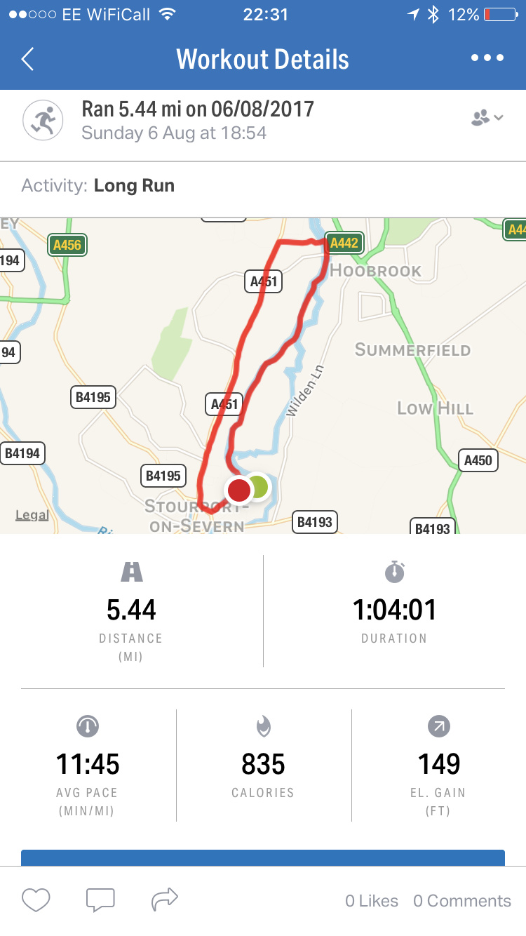 12 minute test pace run. Warm up of 10 mins, steady fast ish pace and 10 mins of jog -walk to cool down.