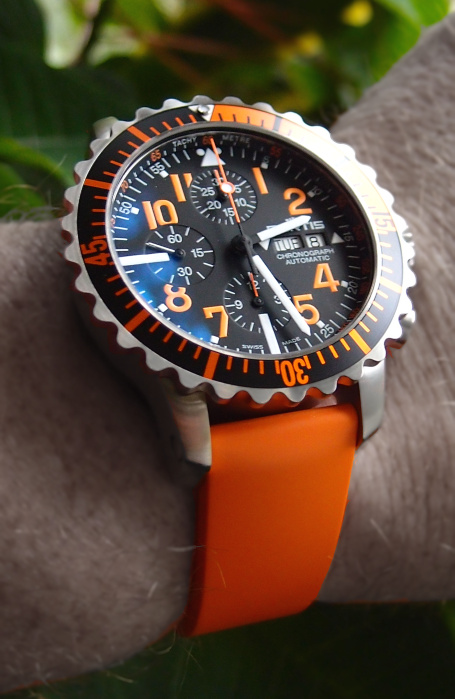 Wearing the Hirsch strap I got from Guy as I can’t quite face chopping-up the brand-new one it came with. My wrist smells like a classy orange condom. Mmmmm…