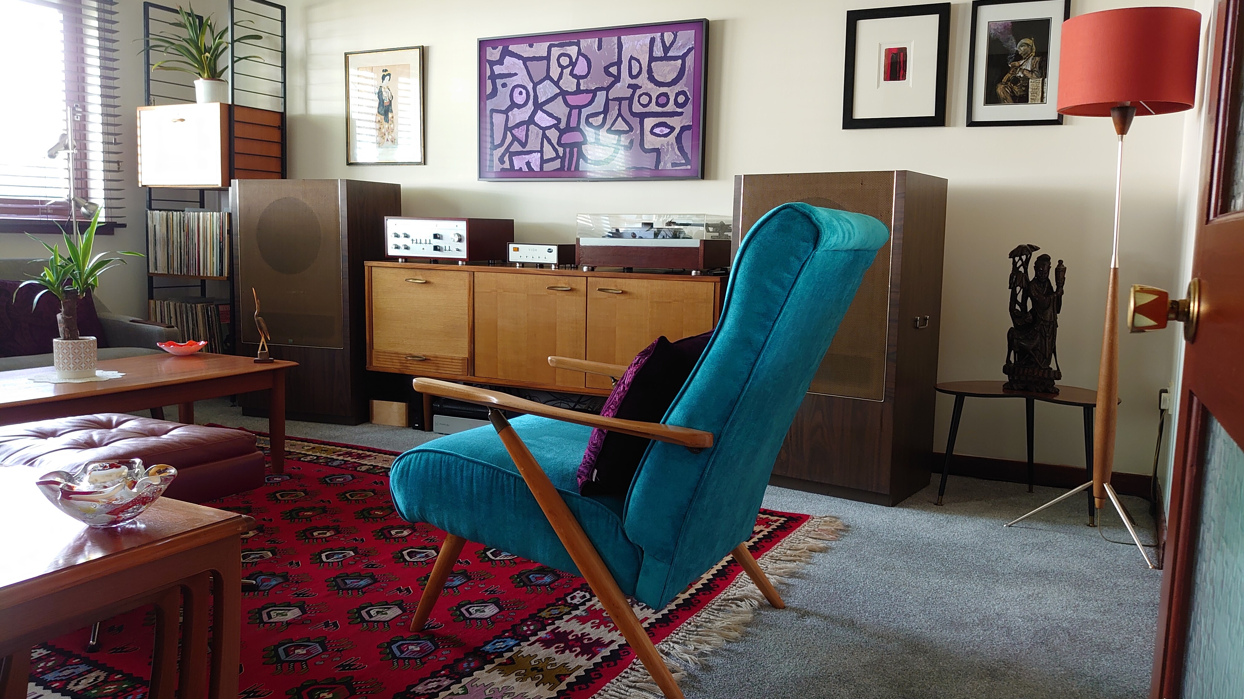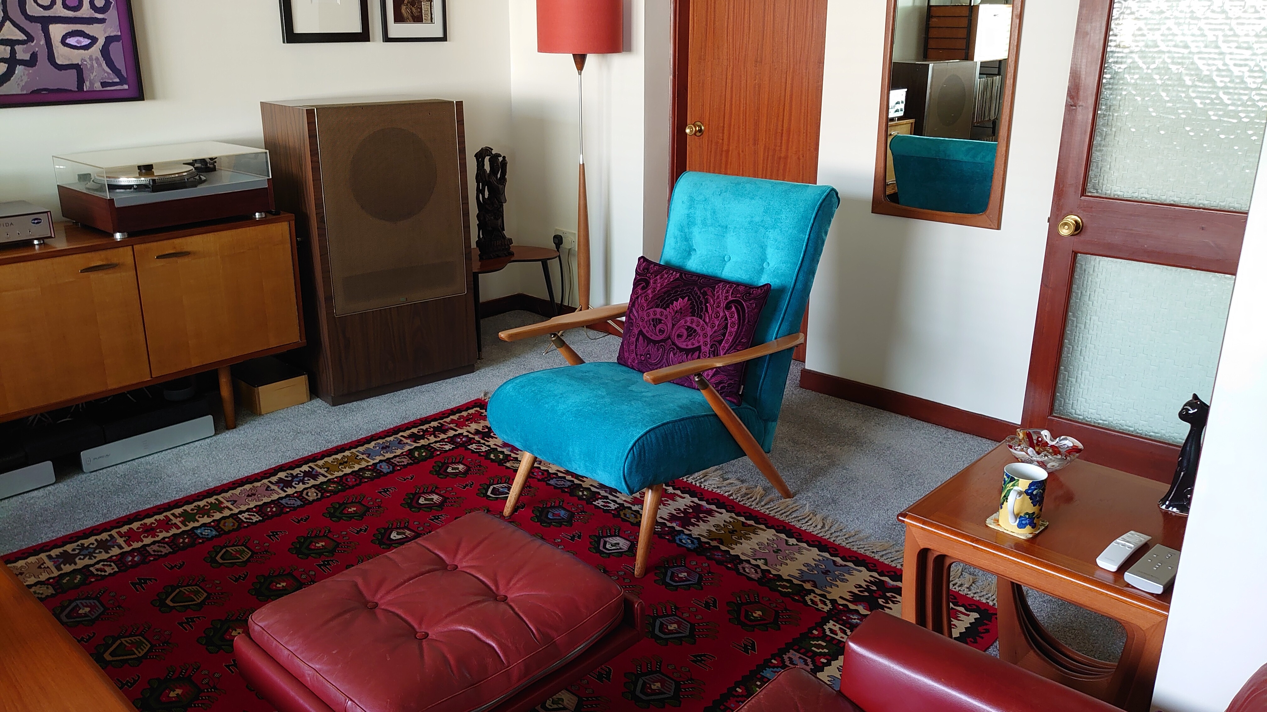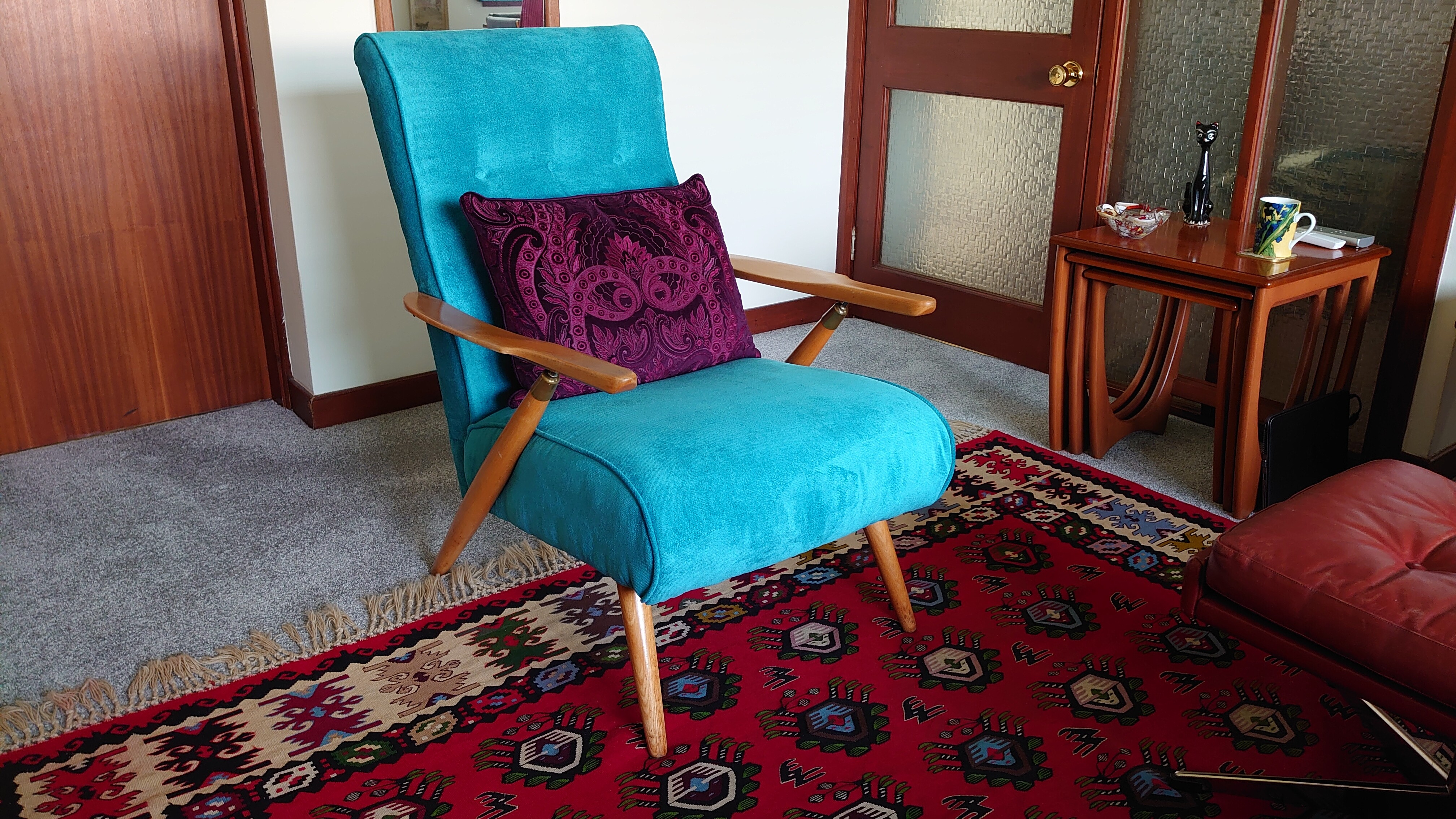 I sold my dark brown leather 60’s bentwood armchair today and replaced it with this unusual 1950’s recliner that has been freshly re-upholstered in teal. For some reason the phone camera can’t capture the colour properly and is making it look electric blue which it is not.