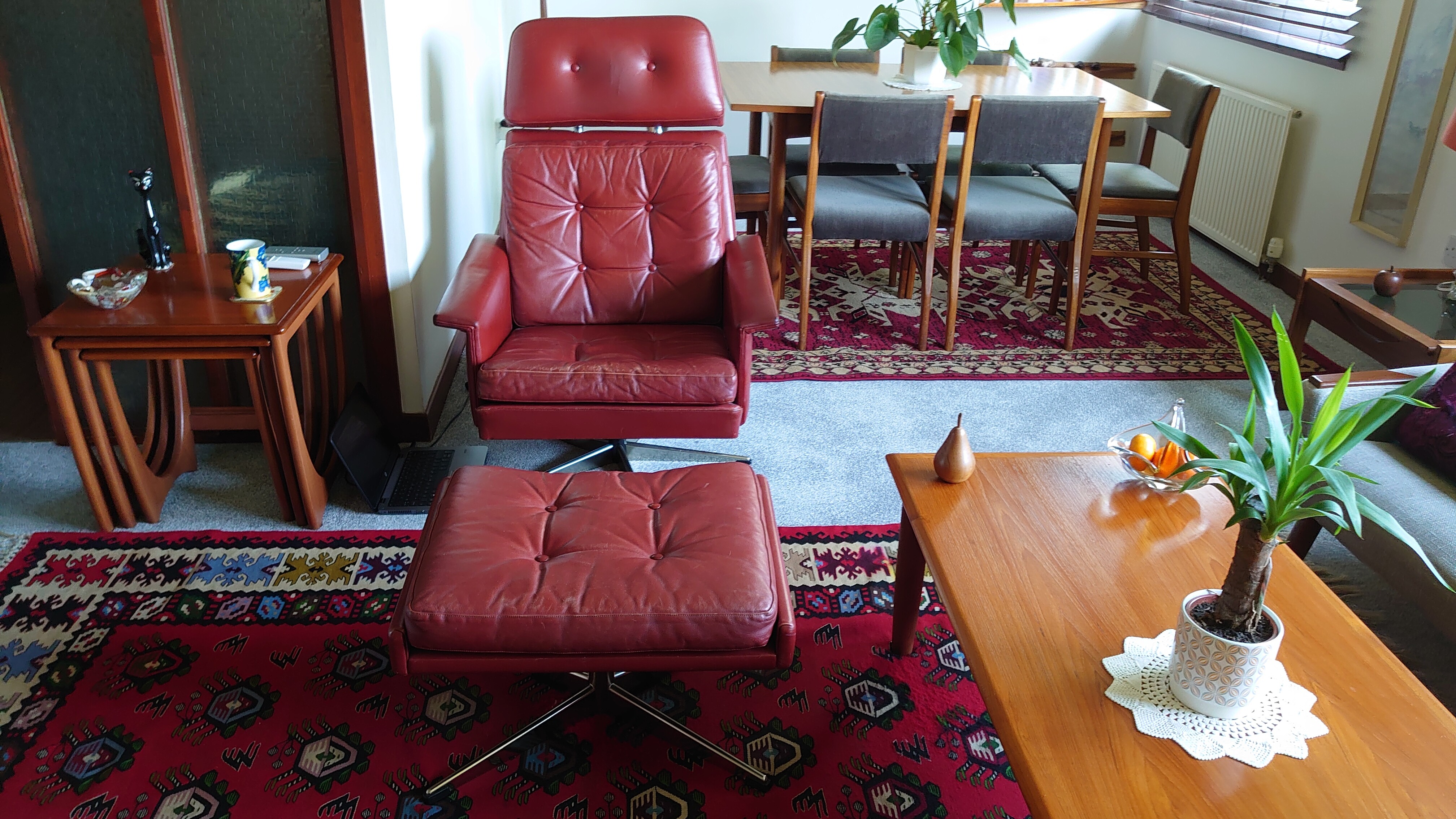 That’s an idea but I think it would be a lot less hassle just to buy the matching armchair. Also one of the reasons I’m thinking of selling the swivel chair is because it’s very 60’s in style whereas most of my furniture is from the 1950’s although some of the occasional tables are later. I may change them out too at some time in the future. It is a work in progress.