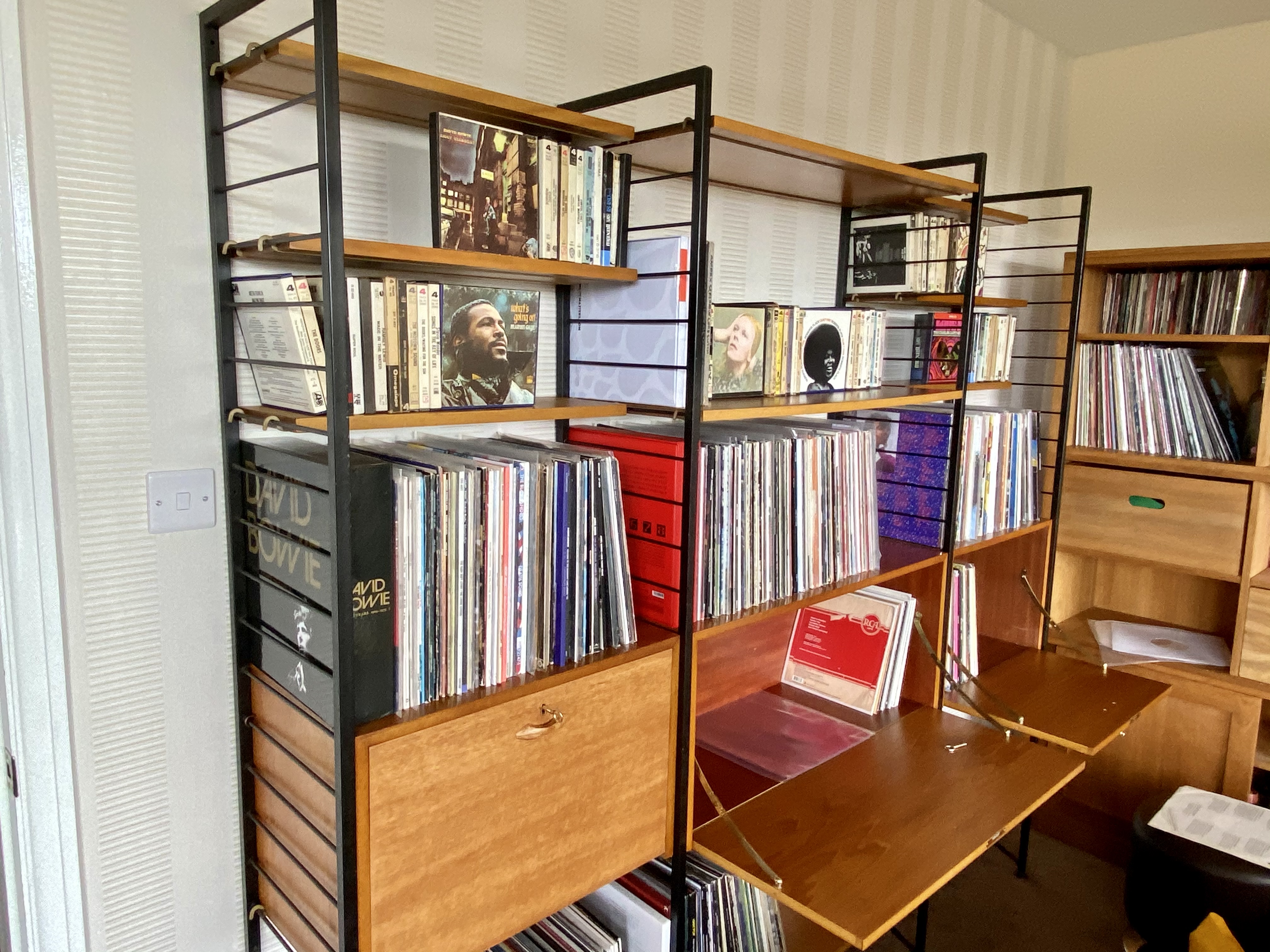 About half way through trying to organise my records and tapes onto the Ladderax. Hel has come around and likes it now