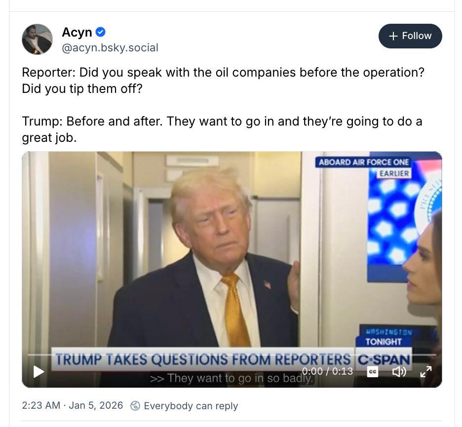 Sorry to re-cover old ground but Iād slightly missed that in invading Venezuela, Trump: