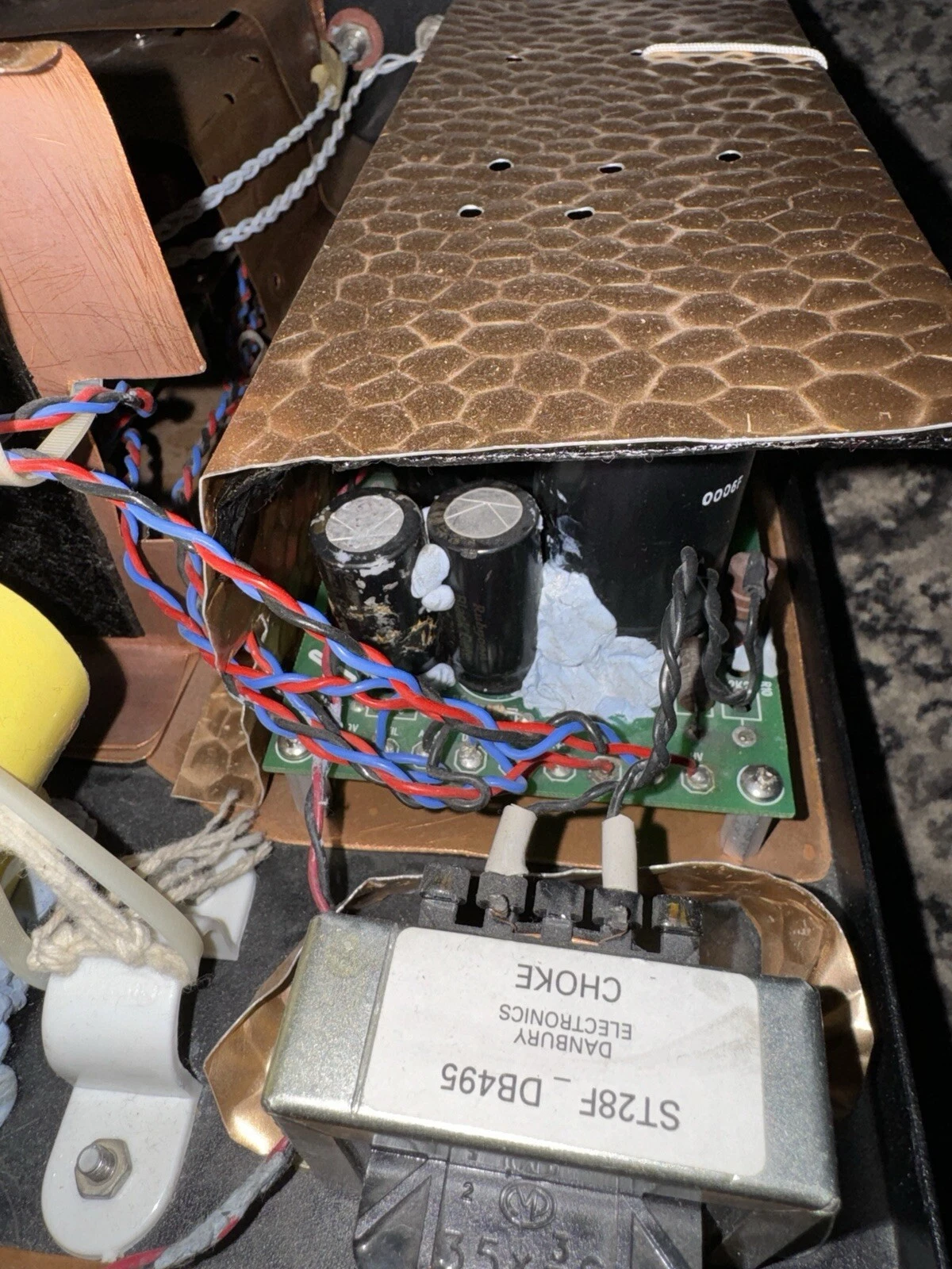 What’s the white stuff on the circuit board in this photo? Hot glue? Leaking cap? Blue tac? It does not inspire confidence.