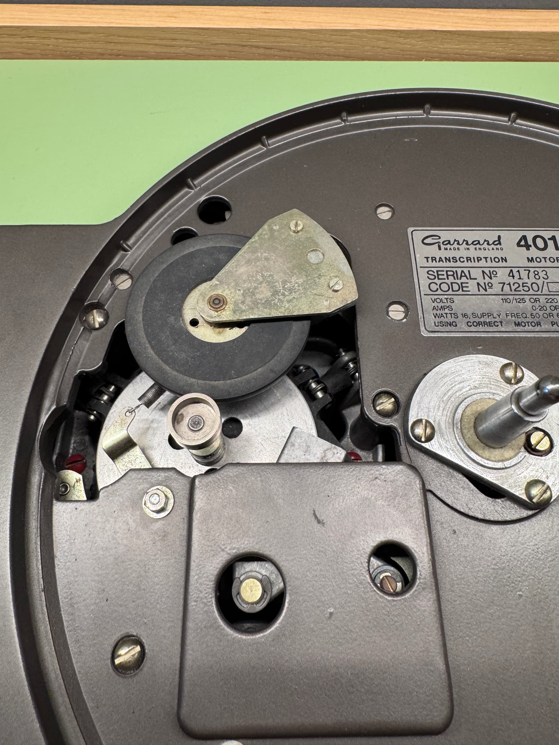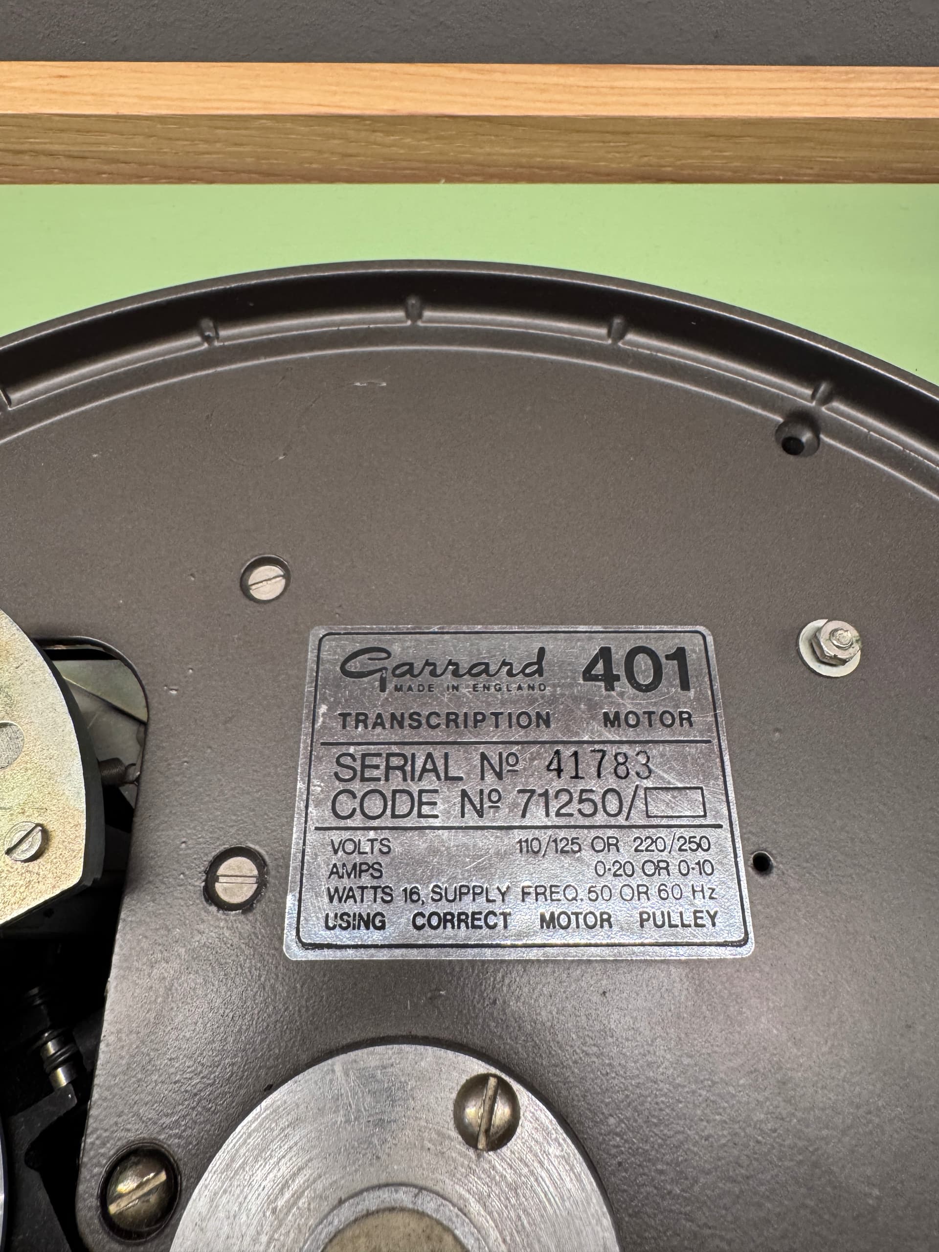 Garrard 401 serial no 41783. As far as I know it’s not been serviced but holds speed and is pretty damn quiet. Cosmetically very good. One or two small marks.