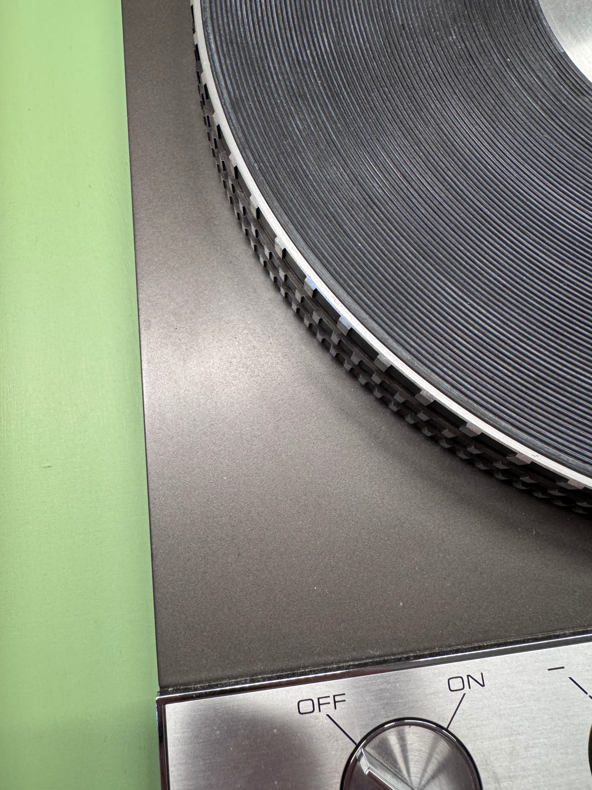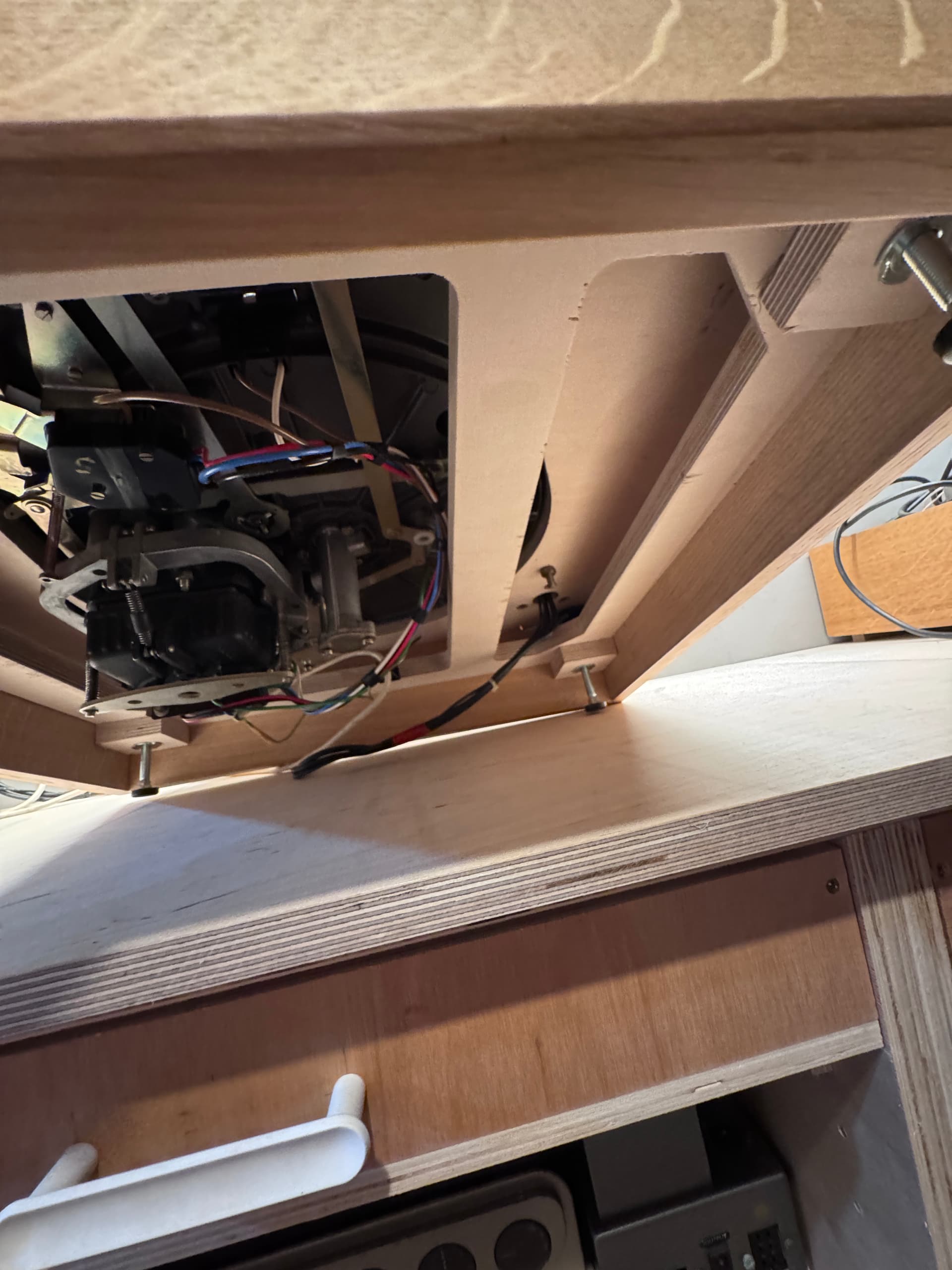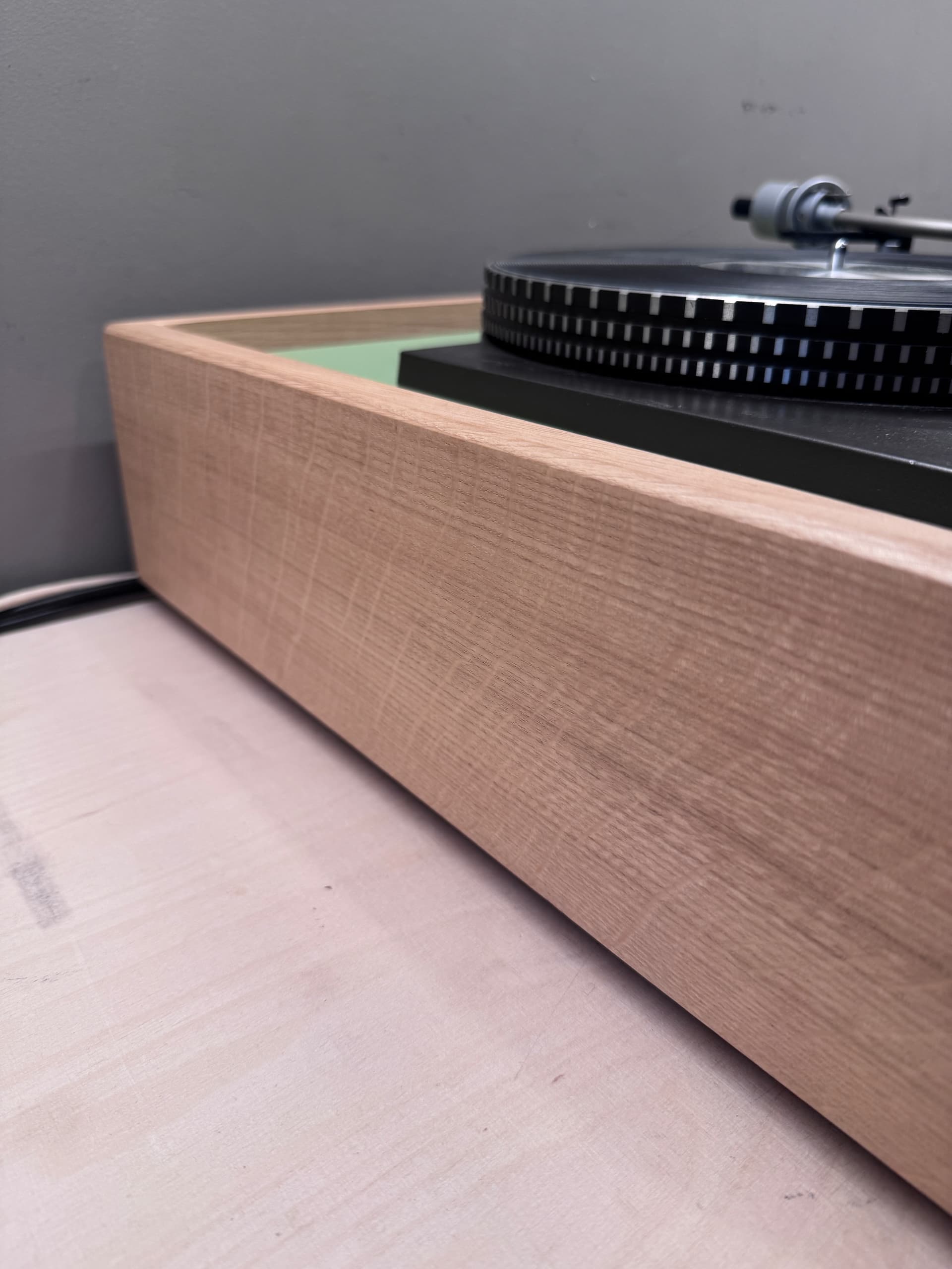 Loricraft style plinth I built. Solid oak frame, with birch plywood brace in the middle and birch plywood top board painted green. The one benefit of the Loricraft style is just being able to change the whole top board for different motors and arms.
