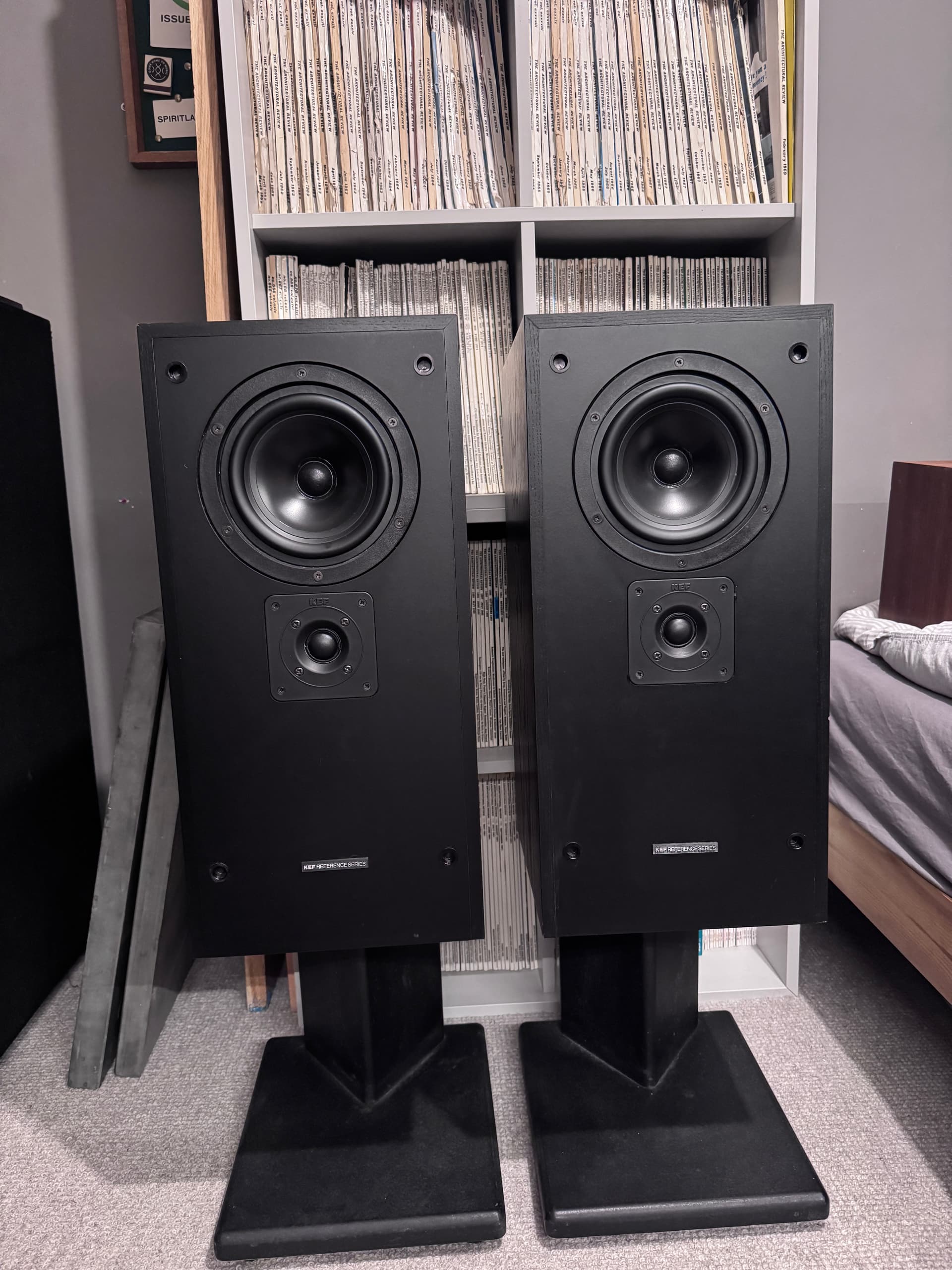 Kef reference 103/3. Both working and with the proper stands as they have a port on the base. one of the rear corners has a small ding, Again have marks but not horrendous. No kube if these were supposed to have one, can’t remember. Have the grilles, but some of the fabric needs gluing back on the edges £80