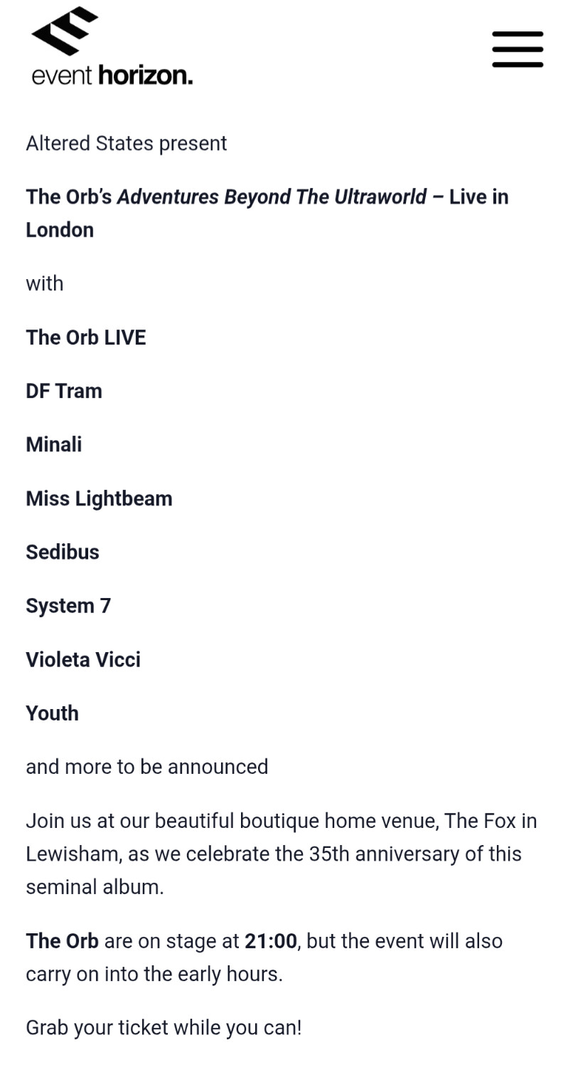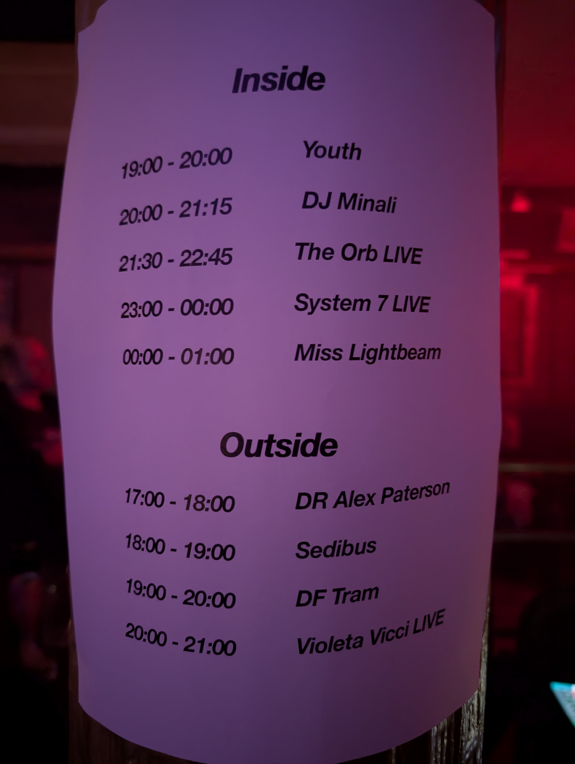 Tonight is The Orb plus a cast of thousands at the Fox and Firkin in Lewisham. It’s basically Alex and his mates, so System 7, Sedibus, Youth etc.