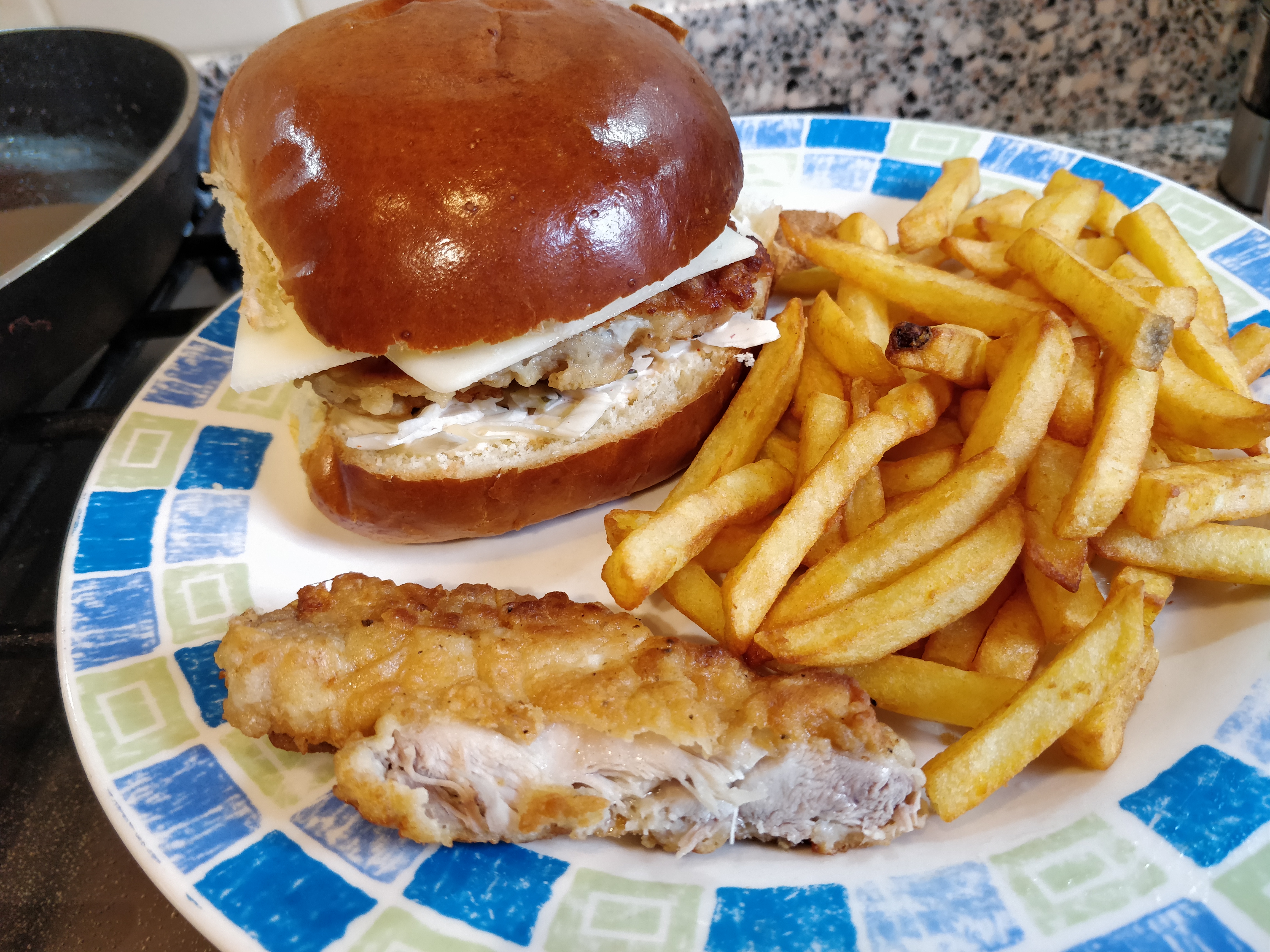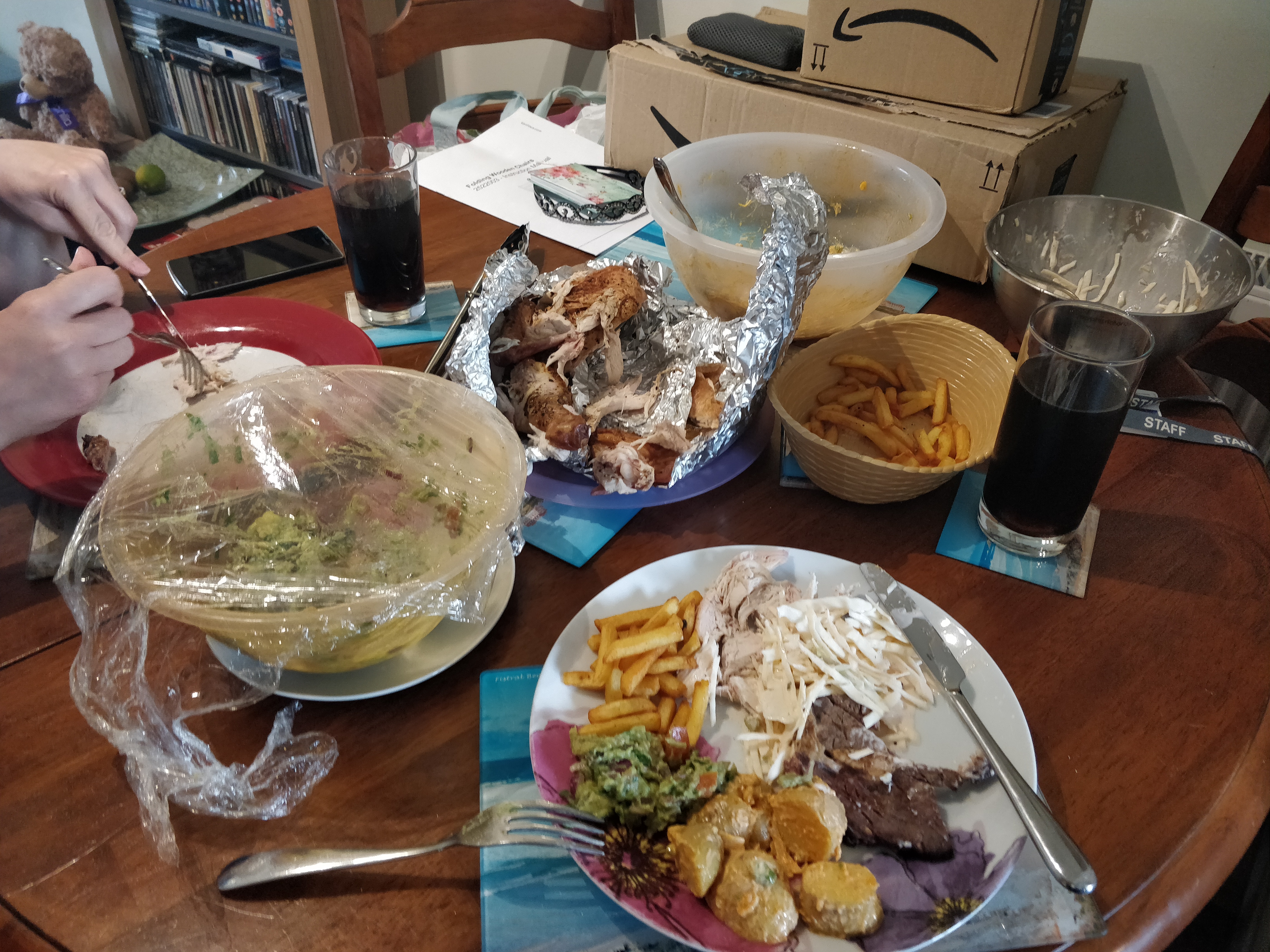 Cold BBQ from yesterday with home made guacamole/coleslaw/potato salad and some frozen chips because I like chips
